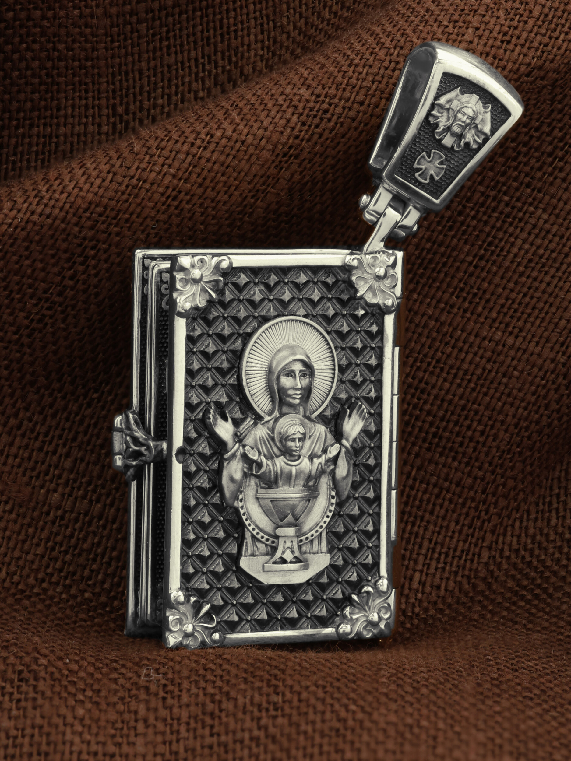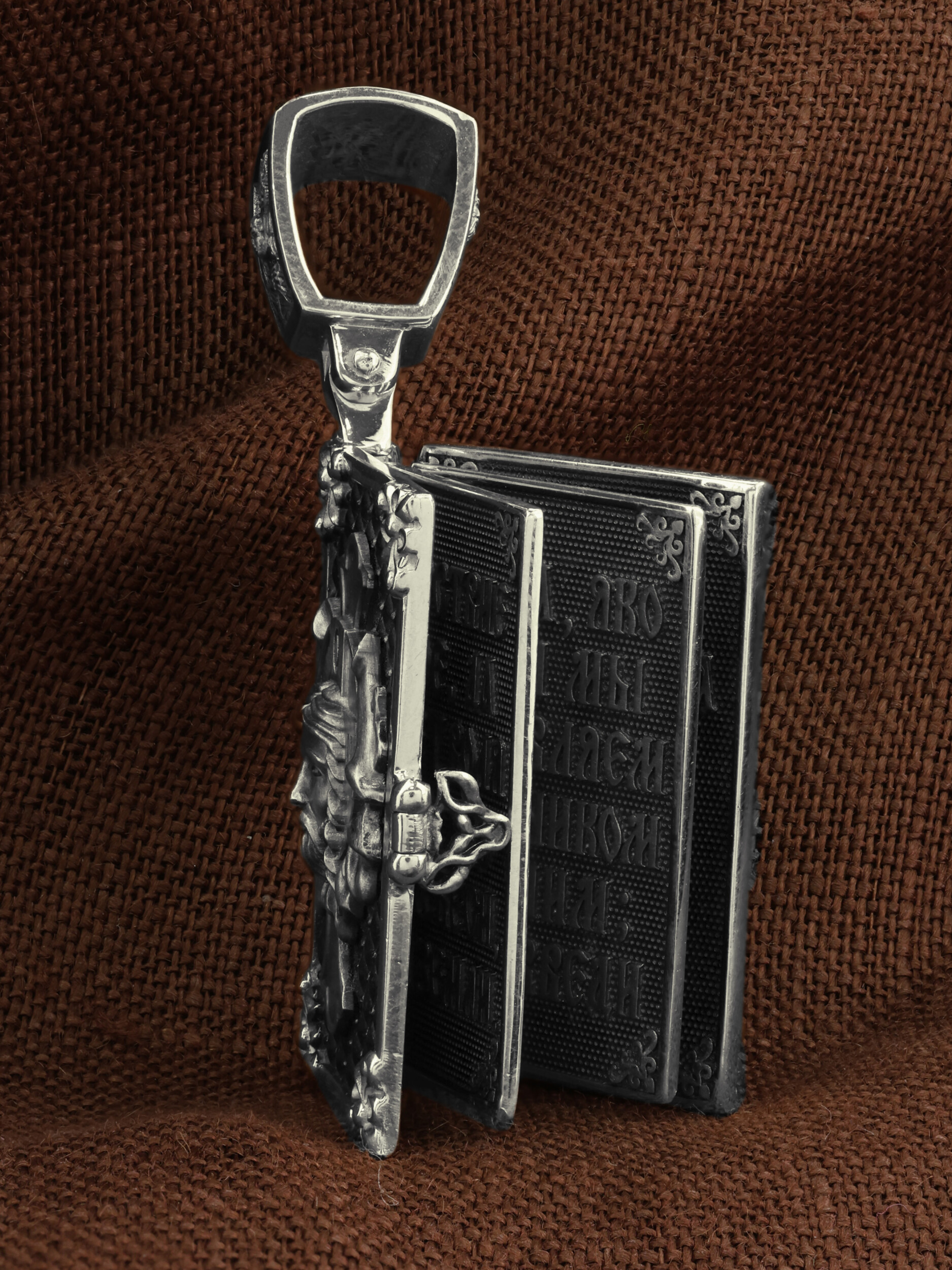 Специальная застежка сбоку скрывает внутреннее содержимое изделия — страницы, на которых выгровированы слова молитвы «Отче наш»: «Отче наш, Иже еси на небесех! Да святится имя Твое, да приидет Царствие Твое, да будет воля Твоя, яко на небеси и на земли. Хлеб наш насущный даждь нам днесь; и остави нам долги наша, яко и мы оставляем должником нашим; и не введи нас в напасть, но избави нас от лукаваго: Яко твое есть царствие и сила и слава во веки. Аминь».