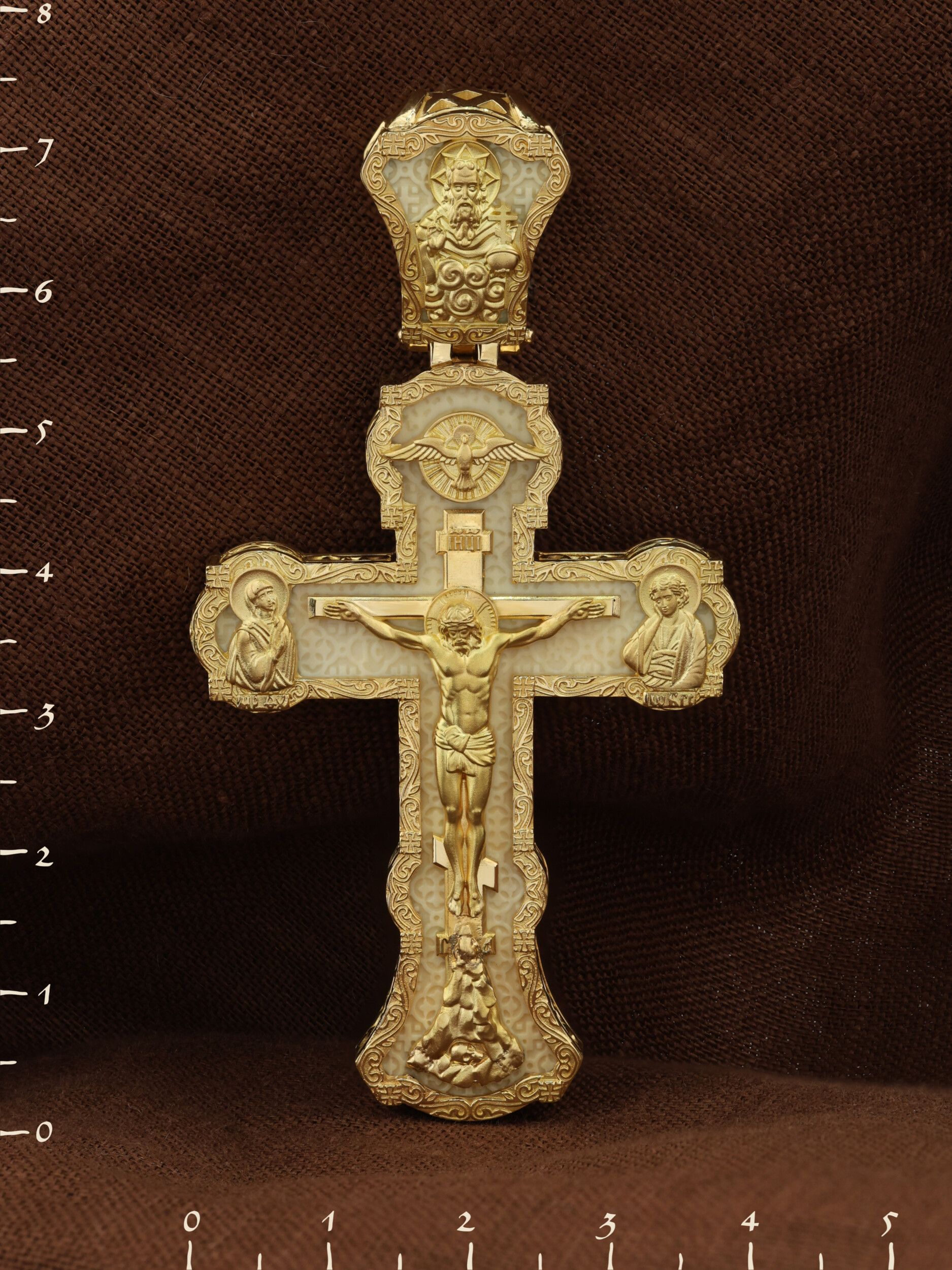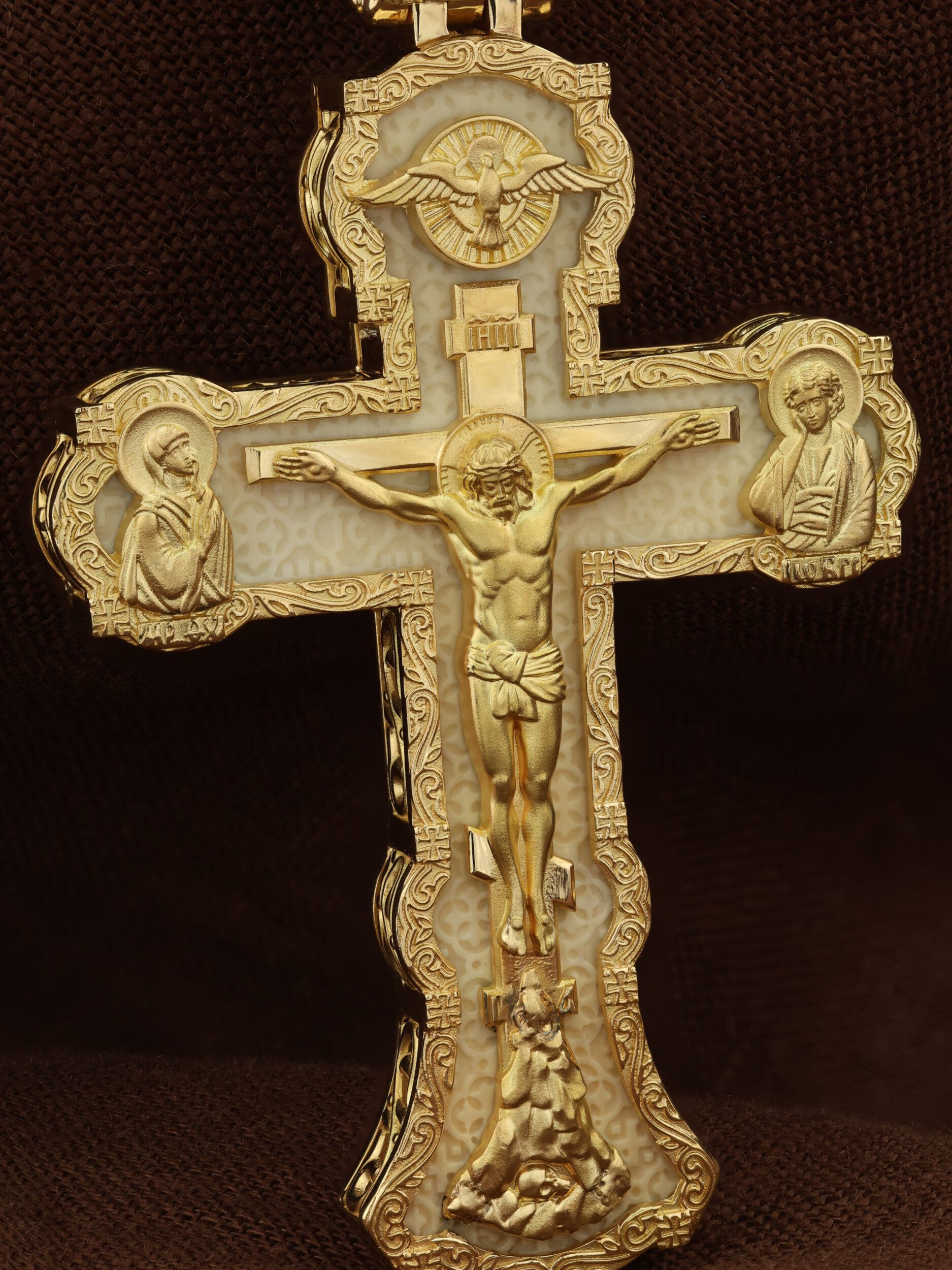 На лицевой стороне креста изображено Распятие Господа и Спасителя нашего Иисуса Христа. Христос, подвергнутый на кресте мучительной казни, своими страданиями искупил нас от древнего греха и даровал нам жизнь вечную. Без Распятия не было бы Воскресения Христова, и поэтому Крест из орудия казни обратился в святыню, в которой действует Благодать Божия. Через крестную жертву Бог раскрывает нам Свою безмерную любовь и призывает к ответной любви. На верхней табличке, выше головы Иисуса, расположена надпись, составленная Понтием Пилатом на трех языках — «IНЦI». Она означает «Иисус Назорей, Царь Иудейский». Надпись «IС ХС» означает Иисус Христос и помещается на разных сторонах поперечной (большой) перекладины креста. Крест стоит на горе камней, символизирующих Голгофу. В ее основании различается череп– это голова Адама. У Креста стоят оплакивающие Господа Божия Матерь и апостол Иоанн Богослов. Из всех апостолов об одном лишь Иоанне Богослове говорится, что он стоял на Голгофе у креста Спасителя, не заботясь о собственной безопасности. Он услышал обращенные к Ней с высоты Креста слова Распятого Господа: «Жено, се сын Твой» и к нему: «Се Мати твоя». С этого времени Иоанн взял Матерь Божию к себе, и Она жила в его доме до самой смерти. Над Распятием — изображение Духа Святого в виде голубя, сходящего с Небес. На кулонном кольце изображен Бог Отец.