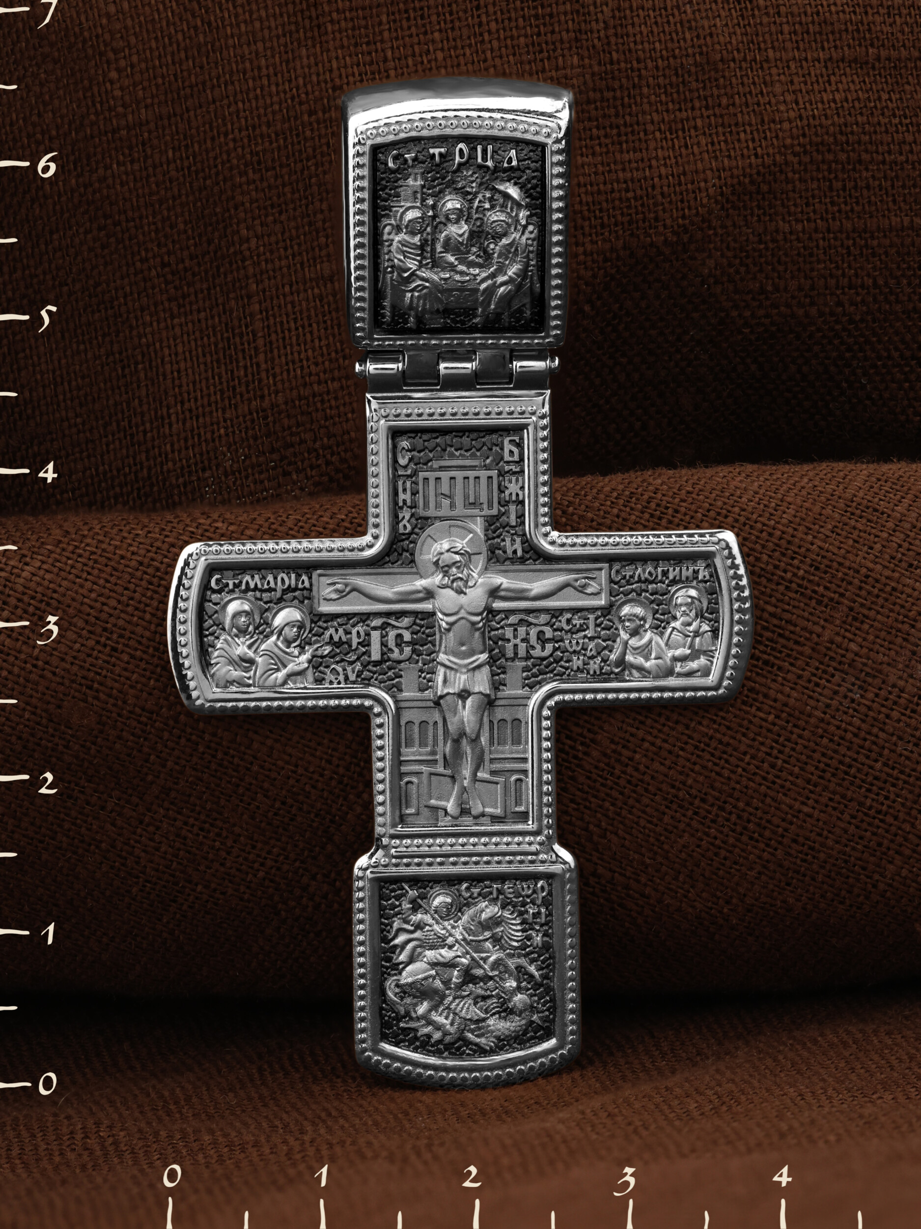 На кресте изображено Распятие Господа нашего Иисуса Христа. Ему предстоят Святая Мария Магдалина, Пресвятая Богородица, апостол Иоанн и Святой Иосиф, свидетели крестных страданий Господа. Вверху — икона Святой Троицы, на которой запечатлено явление Триединого Бога праотцу Аврааму в виде трех ангелов. В нижнем клейме изображено Чудо Святого Георгия о змие. Великомученик Георгий почитается как покровитель воинов, защитник от злых сил, помощник в духовной борьбе.