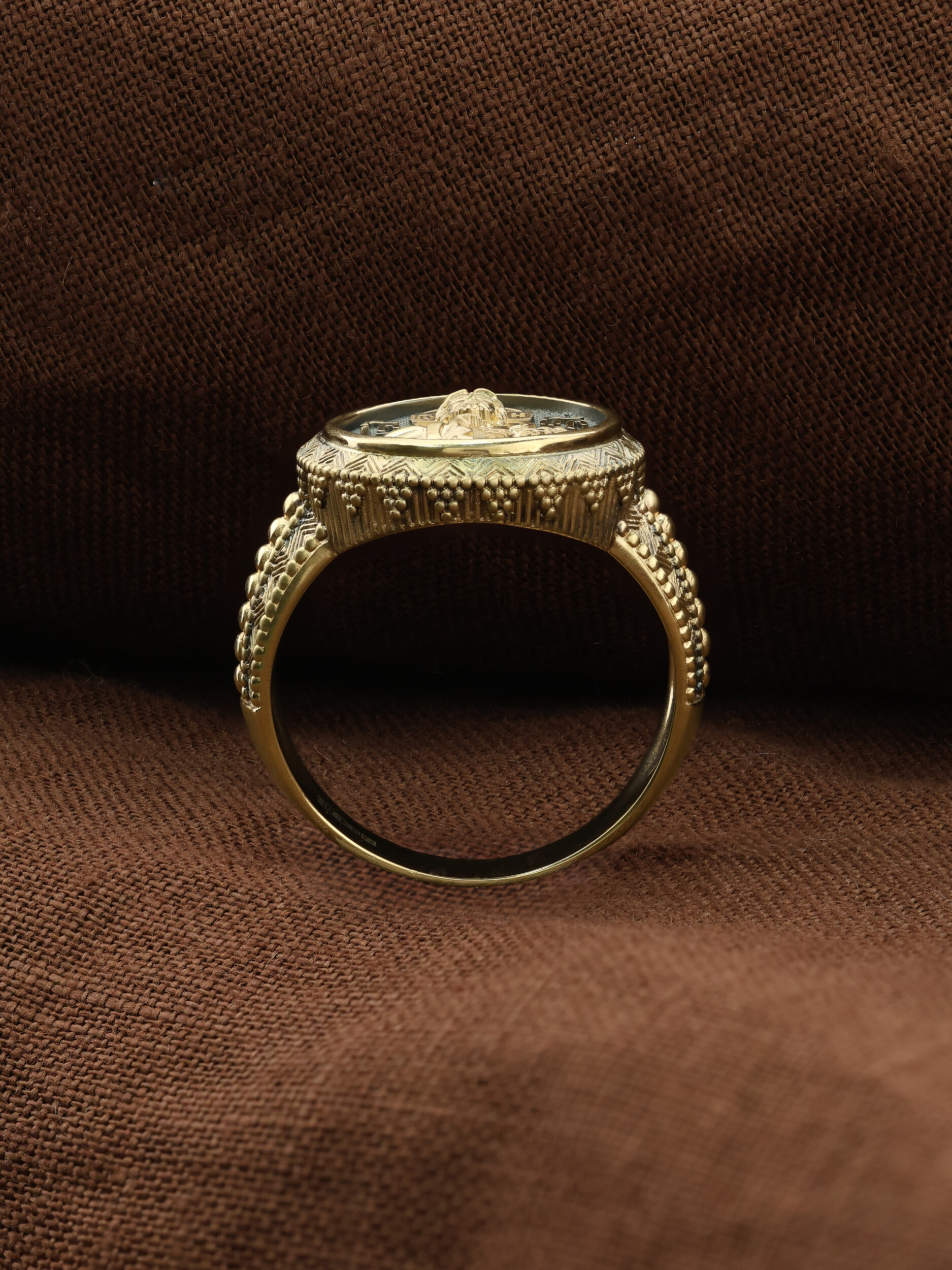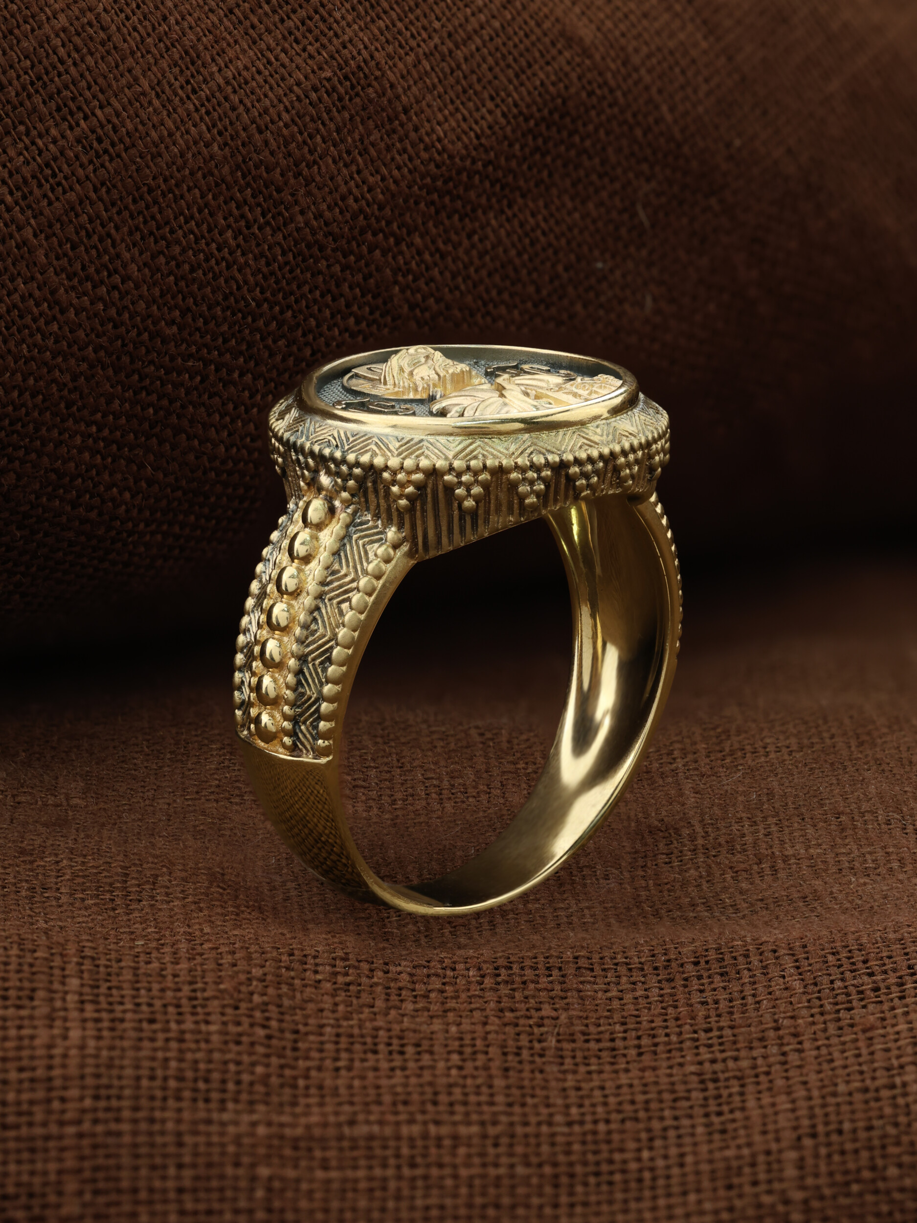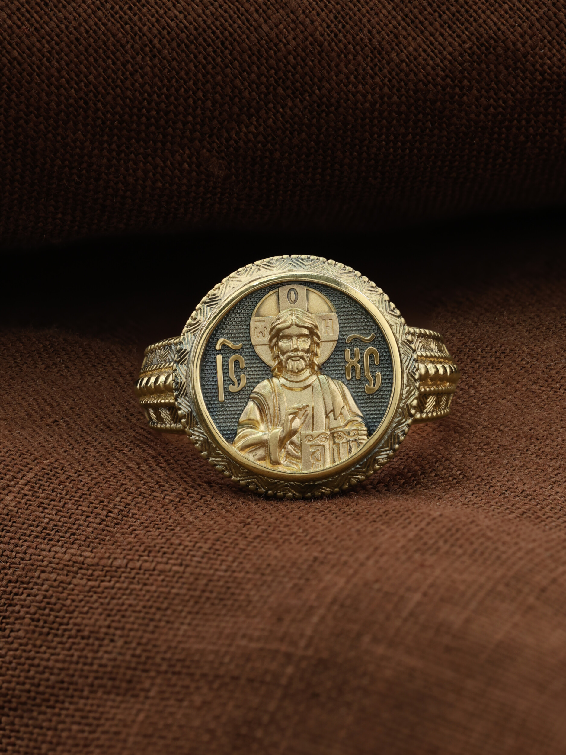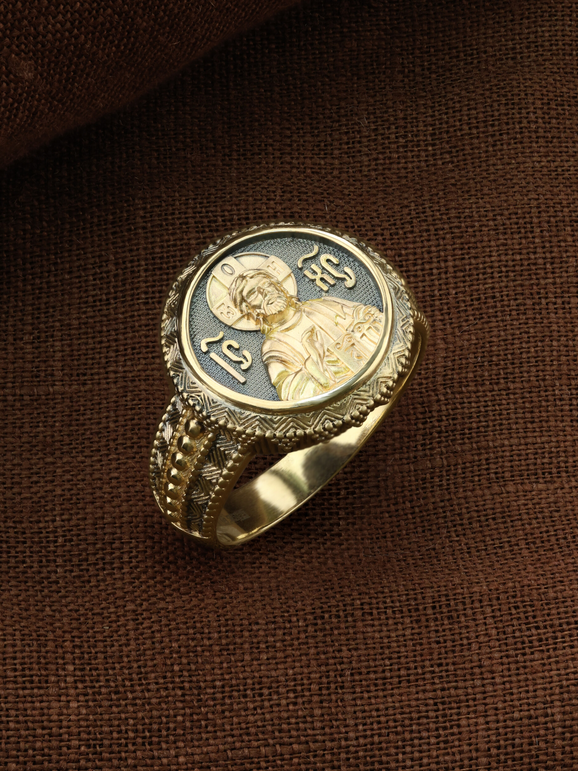 Кольцо «Господь Вседержитель» выполнено в древних христианских традициях. Господь Вседержитель или Пантократор (от греч. всевластный, всесильный). Он представлен как Царь Небесный и будущий Судия мира. Именование Иисуса «Вседержителем» указывает, с одной стороны, на Его Божественную природу: «Аз есмь Альфа и Омега, начало и конец, говорит Господь, Который есть и был и грядет, Вседержитель» (Откр. 1: 8). С другой стороны, такое именование связано и с человеческой природой Христа, искупившего крестной жертвой людские грехи и обновившего тем самым человеческую природу. Господь Иисусь Христос изображен фронтально огрудно. Главу Спасителя осеняет нимб, на нем угадывается крест. Крест символизирует голгофскую жертву Спасителя. По греческой традиции, на нимбе написаны буквы Омега, Омикрон, Ню — вместе они обозначают слово Сущий, одно из имен и характеристику Бога, согласно Священному Писанию. Правой рукой Он благословляет, а левой держит Евангелие — благую весть, принесенную Христом всему миру. Также означает она тот новый мир, который будет сотворен Богом после второго пришествия Христа. Символизирует и Книгу Жизни, где записаны имена всех, возлюбивших Бога. Всемогущий Бог предстает здесь не как обличающий судья, а как милостивый отец, ждущий возвращения блудных детей.