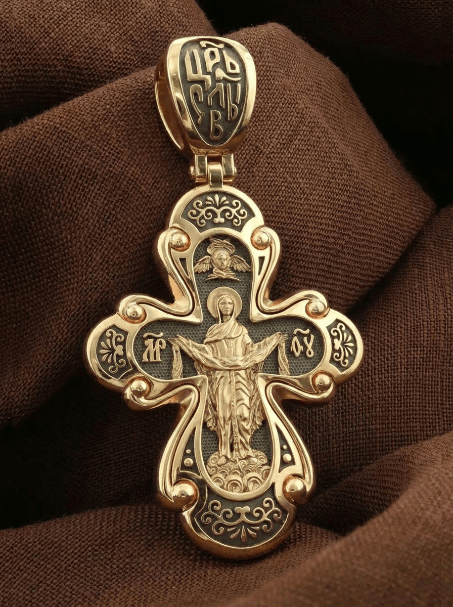 На обороте креста изображена икона Покрова Пресвятой Богородицы. Праздник Покрова Божией Матери является воспоминанием чуда, которое произошло во Влахнернской церкви 1 (14) октября 910 года: Пресвятая Богородица явилась верующим над алтарем храма и распростерла над ними Свое покрывало. В этот день Божья Матерь открыла людям, что Она является Ходатаицей за них перед Богом. Богородица простирает Свой молитвенный покров над всеми православными христианами и умоляет Сына Своего о даровании вечного спасения каждому человеку. Над образом изображен крылатый Серафим.