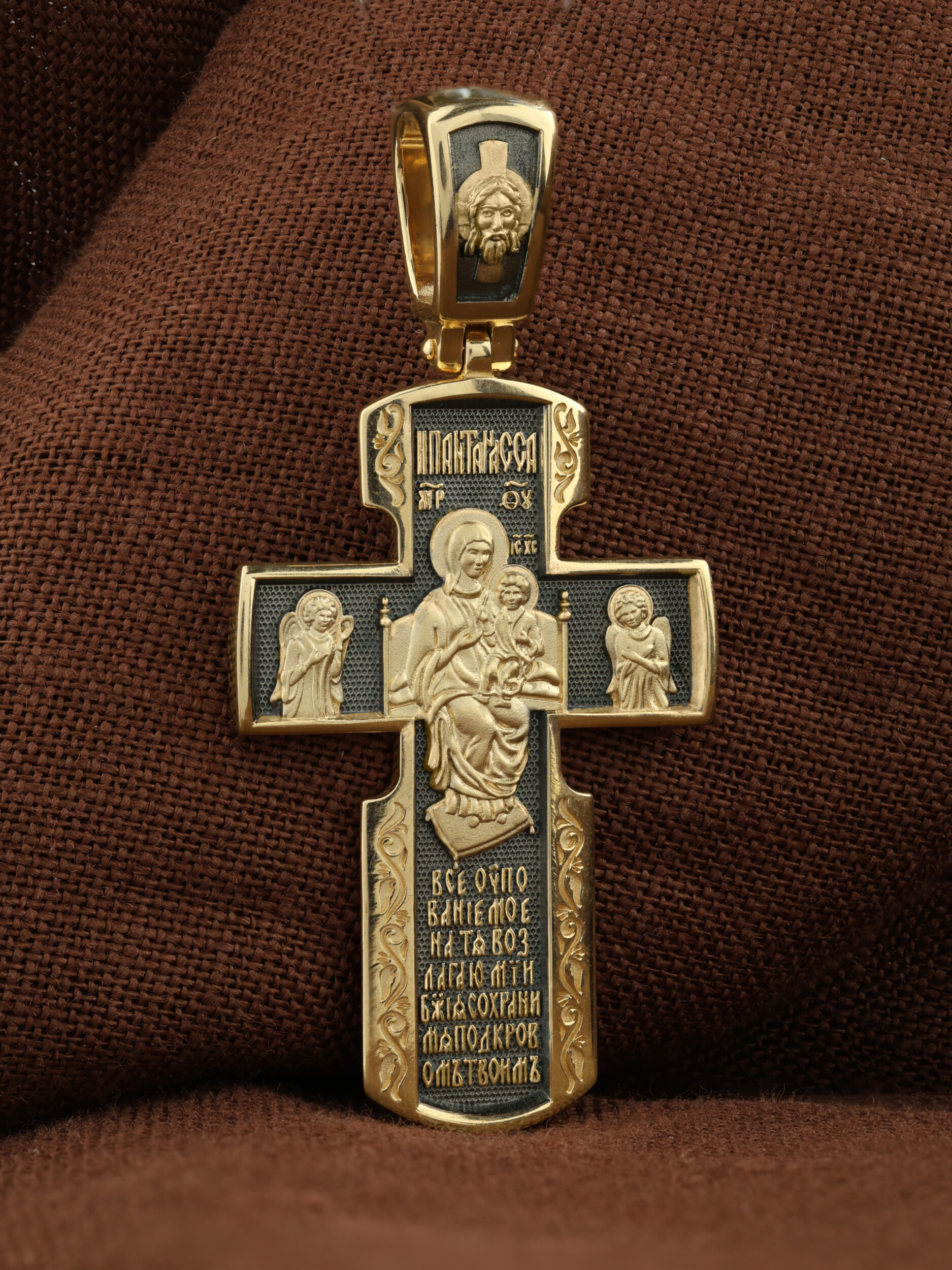 Весь оборот креста занимает икона Божией Матери «Всецарица». Внизу креста написана молитва обращенная к Божией Матери «Все упование мое на Тя возлагаю, Мати Божия, сохрани мя под кровом Твоим».