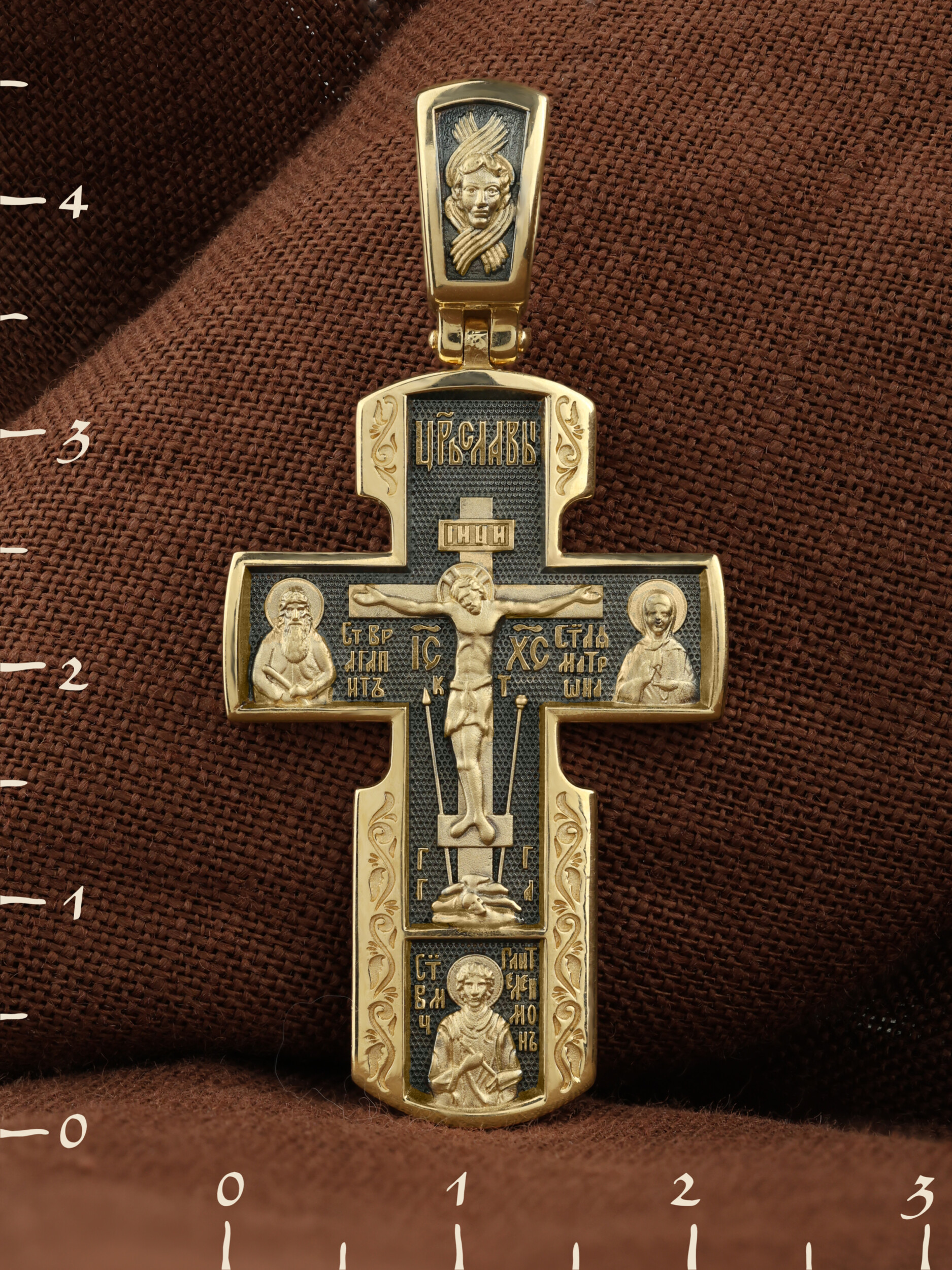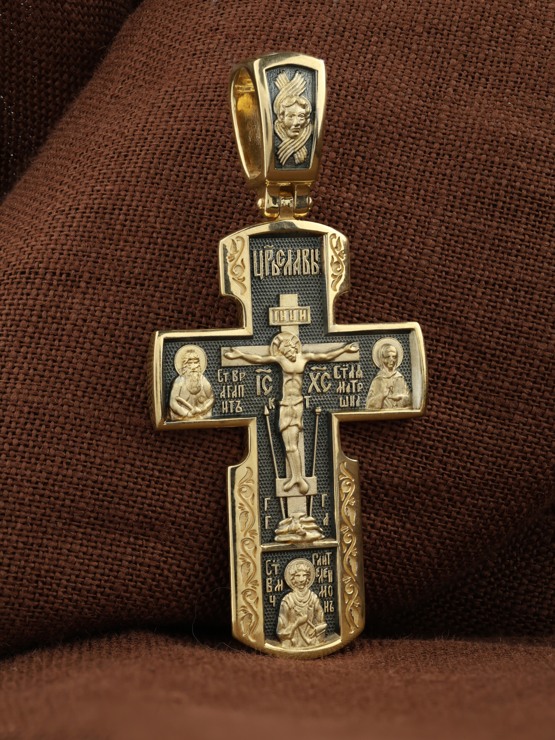 Как действенная помощь в немощах и болезнях был создан крест с образами святых целителей и со знаменитой афонской иконой Божией Матери «Всецарица». Над титлом видим слова «ЦРЬ СЛВЫ» — Царь Славы. Верхняя перекладина символизирует собой табличку с надписью «IHЦI» — Иисус Назарянин Царь Иудейский. Под перекладиной пишется сокращенно имя Спасителя «IC XC» — Иисус Христос. Возвышение, на котором стоит Крест, символизирует гору Голгофу, на которой произошло Распятие. У подножия Креста изображают прах Адама, обозначенный черепом. Справа от Распятия помещен образ прославленной святой блаженной Матроны. Слева — икона преподобный Агапита. Этот святой жил в пещерах Киево-Печерского монастыря в XI веке и бескорыстно врачевал мирян и монахов. У основания Креста Господня изображен великомученик Пантелеимон Целитель. Господь даровал удивительную силу его молитве. Ею он исцелял любые болезни и даже воскрешал умерших.