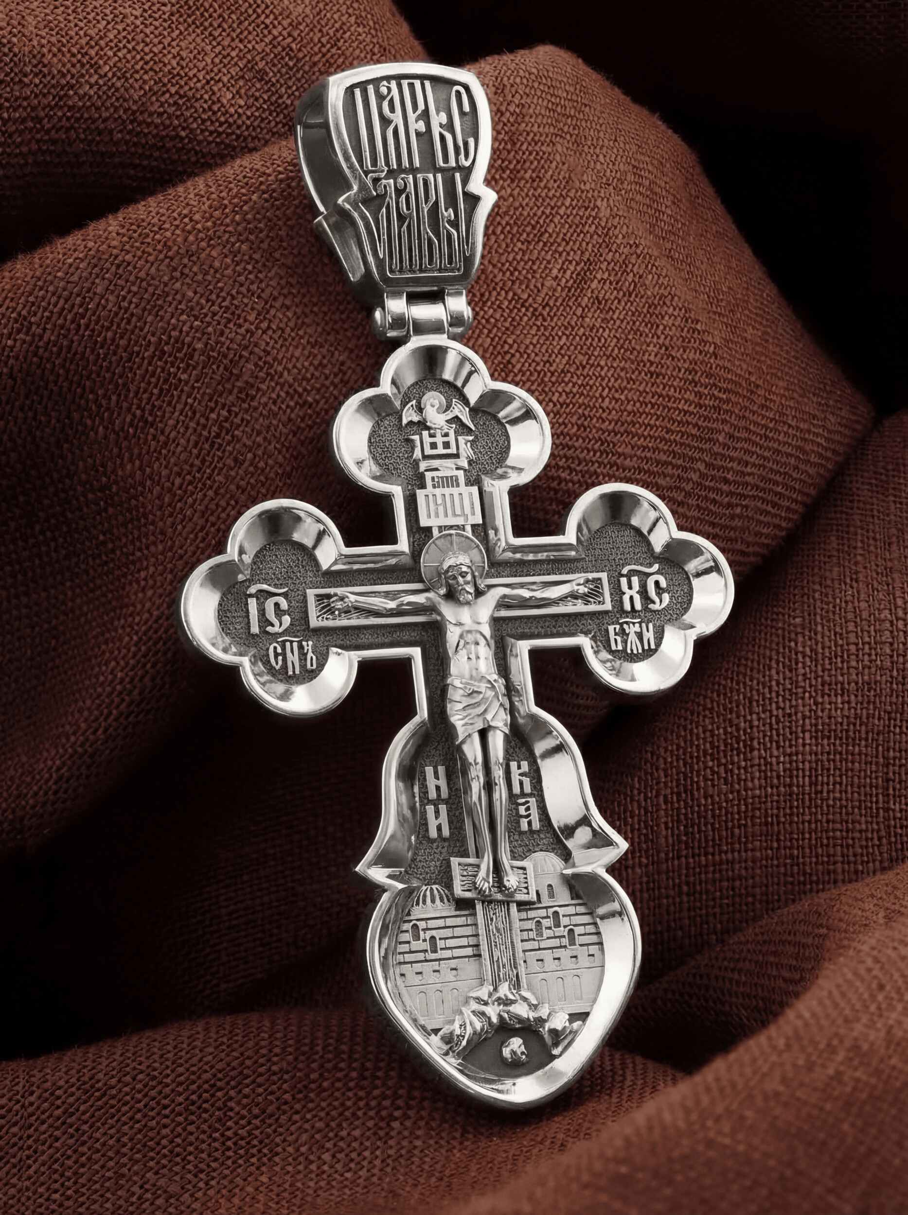 Распятие сопровождается иконографическими надписями, прославляющими Господа Иисуса Христа. На боковых оконечностях размещены инициалы святого имени Спасителя «IС ХС» и надпись «Сын Божий», обозначающая Его божественную природу. На подножии Креста можно прочитать надпись «НИКА» (Победитель) — символ победы Господа над смертью. Венчает лицевую сторону образ Святого Духа в виде голубя.
