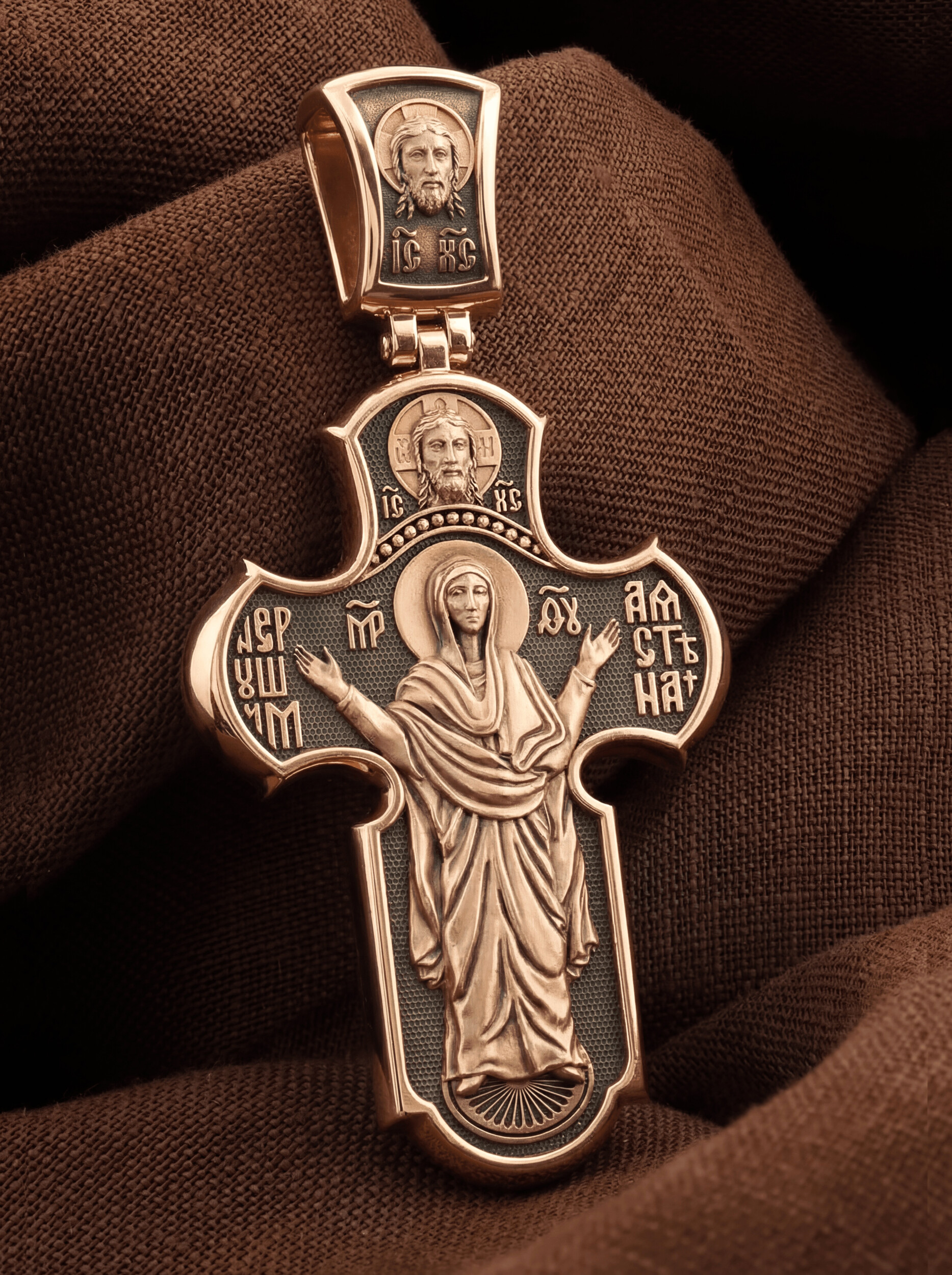 На обороте креста изображена одна из самых древних и почитаемых святынь — икона Божией Матери «Нерушимая Стена». Это величественное изображение, представляющее Божью Матерь в позе Оранта, с воздетыми в молении руками. Особенно почитается эта икона как помощница в тяжелых жизненных ситуациях, как защитница от врагов и спасительница в смертельной опасности. Над образом Божией Матери помещено изображение Спаса Нерукотворного — образ Спасителя, который Он запечатлел на плате и передал для исцеления больному проказой царю Эдессы. Ему придается победное и защитное значение.