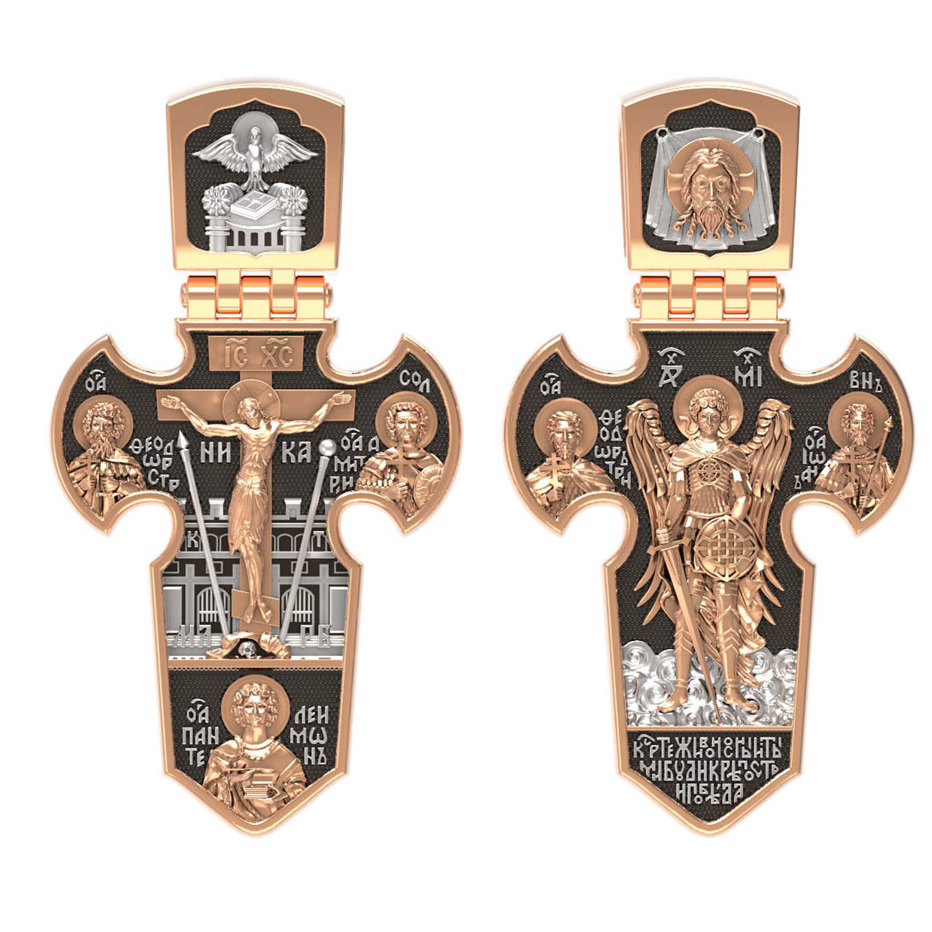 Оборот креста открывается величественной фигурой Архангела Михаила, архистратига Небесного воинства. Его имя означает «Кто яко Бог?», так как он самый могучий и грозный враг зла. С двух сторон от Архистратига Михаила предстоят еще два воина дружины Христовой: великомученик Феодор Тирон и мученик Иоанн Воин. В основании креста молитвенное обращение из Канона, написанного в XIV веке святым монахом Григорием Синаитом: «Кресте Живоносный, ты ми буди крепость и победа». Это молитва воина, восставшего против зла с любовью к ближнему, верой в Бога и надеждой на неизменную помощь Его Небесного Воинства.