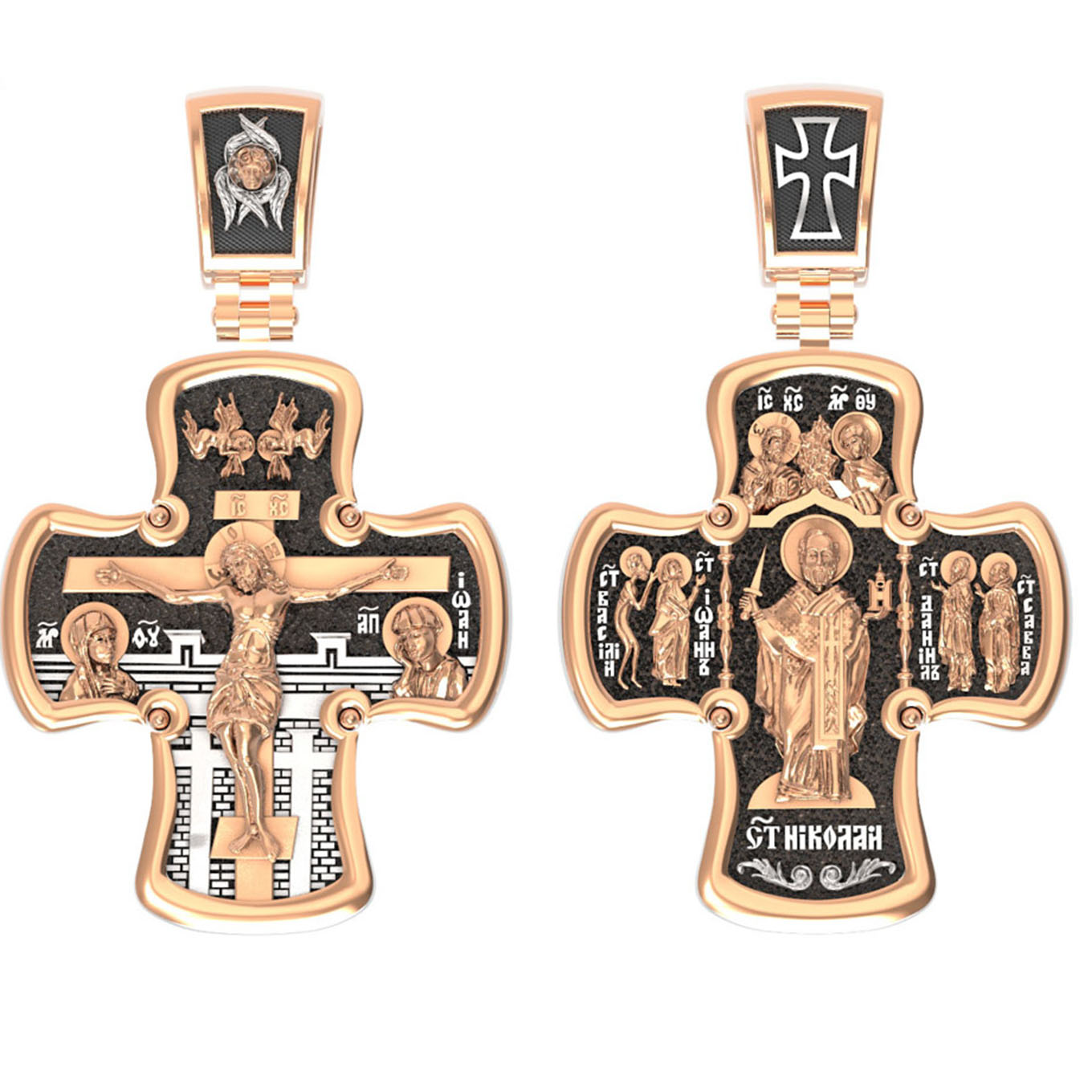 Лицевая сторона креста по канону посвящена Господу Иисусу Христу. Чаще всего на нательных крестах изображается Распятие, которое символизирует победу над грехом и смертью. Своими страданиями Господь искупил грехи человечества: умерев и сошествовав во ад, Он победил дьявола, освободил души праведников от вечной смерти и открыл им Небесные врата рая. Жертва Христа сделала возможным спасение для каждого человека. Поэтому на православных крестах Господь изображается не страдающим, а словно возносящимся и обнимающим весь мир. Он — Спаситель человечества, поправший смертию смерть и призывающий к Себе «все концы земли» (Ис. 45, 22). С двух сторон от Христа изображаются Его Мать, Пресвятая Богородица, и любимый ученик, апостол Иоанн Богослов. Они стояли у Креста неотлучно до самого конца, пока Господь не предал дух Свой Небесному Отцу. Позади — Иерусалимская стена. На иконах она обозначает место казни и символизирует Небесный Иерусалим, путь в который открылся для человечества через Голгофу.