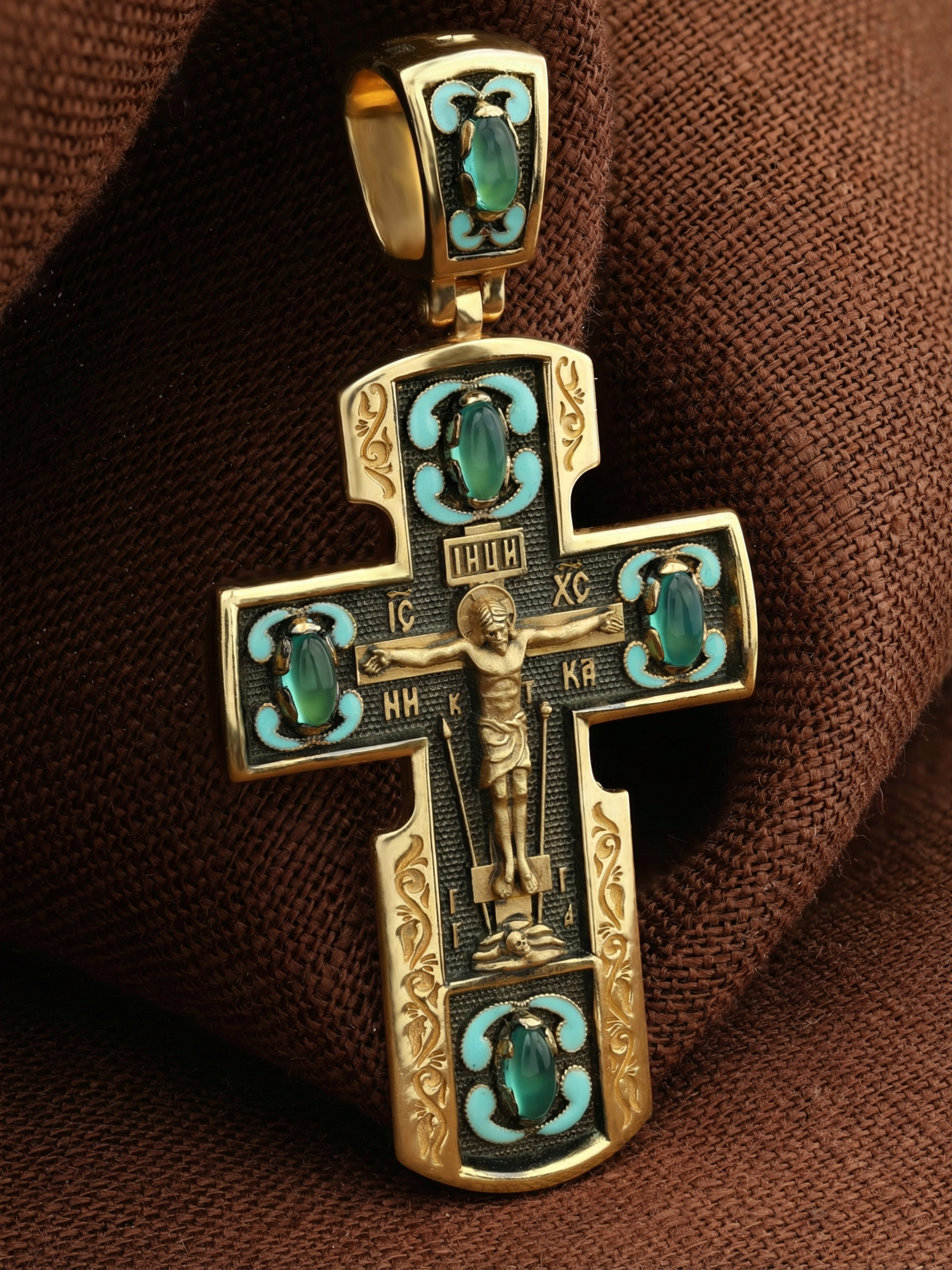 На лицевой стороне креста изображено Распятие Господа и Спасителя нашего Иисуса Христа, отдавшего Себя на смерть, чтобы другие могли жить — жить вечной жизнью, жить с Богом. Через крестную жертву Бог раскрывает нам Свою безмерную любовь и призывает к ответной любви. Своею кровью Господь освятил крест и сделал его проводником Своей благодати, источником освящения верующих. На верхней табличке, выше головы Иисуса, расположена надпись, составленная Понтием Пилатом — «IНЦИ». Она означает «Иисус Назорей, Царь Иудейский». Надписи «IC» «ХС» — имя Иисуса Христа помещаются над средней перекладиной, под ней помещено слово «Ника», что означает Победитель. Крест стоит на горе камней, символизирующих Голгофу, которая обозначена надписью «Г.Г». В ее основании различается череп — это голова Адама, обозначенный надписью «Г.А». Вдоль креста изображены орудия Страстей Христовых: копие сотника Лонгина, которым пронзили подреберье мёртвого Иисуса, чтобы убедиться в Его смерти, и трость с губкой, с которой Иисуса напоили уксусом. Они обозначены буквами «К» и «Т».