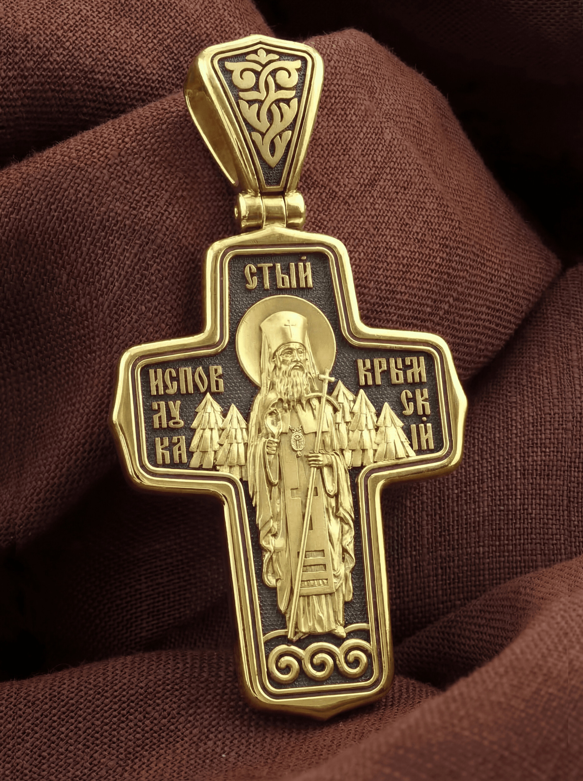 На оборотной стороне Креста помещен образ святителя Луки (Войно-Ясенецкого), архиепископа Симферопольского и Крымского, исповедника (1877–1961). Архиепископ Лука — русский святитель, исповедник, духовный писатель, доктор богословия, а также выдающийся ученый, автор трудов по анестезиологии, профессор хирургии, доктор медицинских наук, лауреат Сталинской премии. Он исповедовал веру Христову в гонениях, тюрьмах, лагерях и ссылке, пережил поношения и пытки, но остался верен Господу. Привел к православной вере тысячи и тысячи людей. Его почитание растет во всем православном мире. Неисчислимо количество свидетельств о чудесной помощи по молитвам к Святителю Луке. Архиепископ Лука советовал: «Главное в жизни — всегда делать людям добро. Если не можешь делать для людей добро большое, постарайся совершить хотя бы малое».