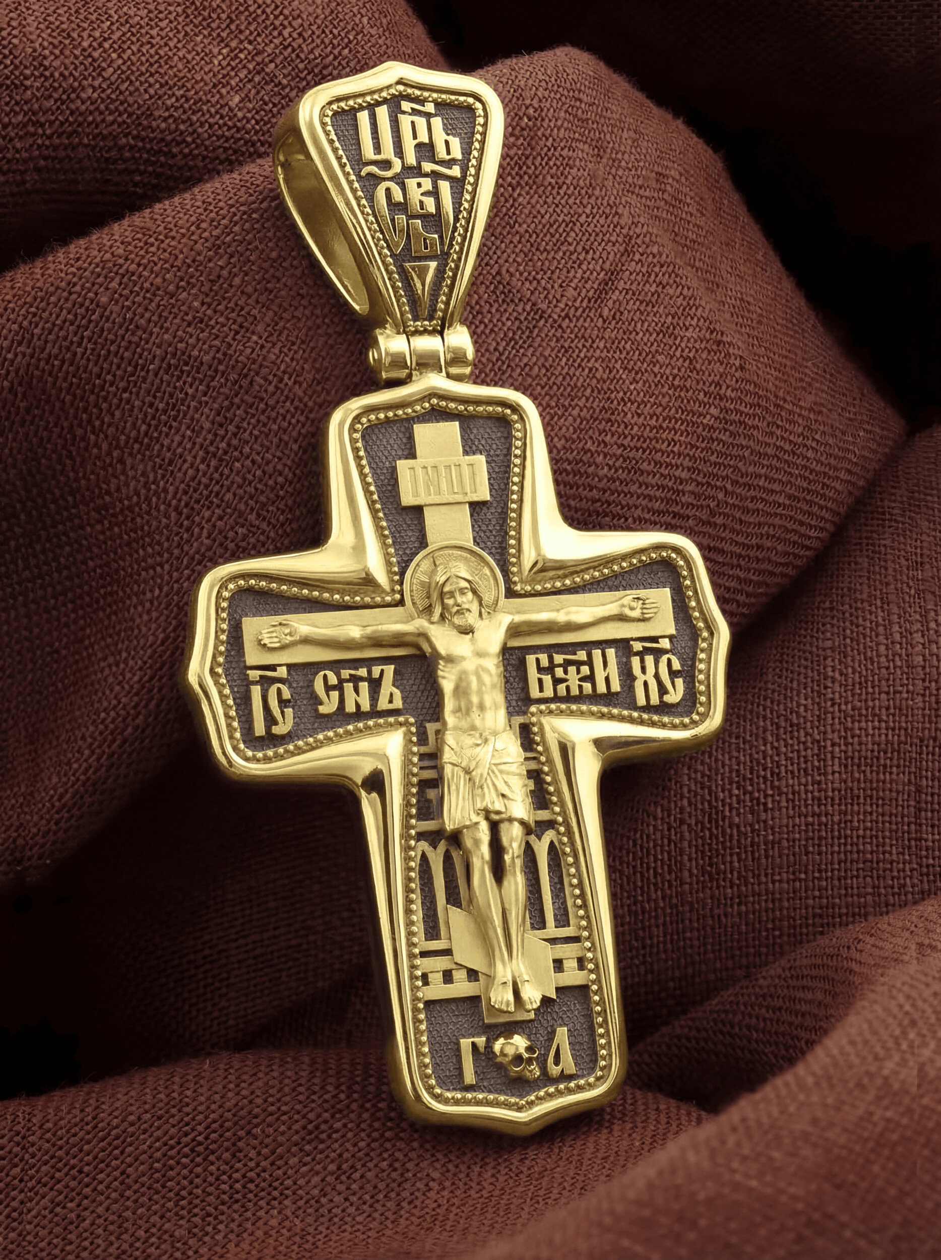 На лицевой стороне креста изображено Распятие Господа и Спасителя нашего Иисуса Христа. Крест- символ спасения и искупления рода человеческого, знамение победы над смертью и адом. Он стал символом восстания из мертвых и обретения вечной жизни в Царствии Иисуса Христа, величайшим символом силы и власти Христовой. Иисус Христос, как искупительная жертва освобождения человечества от власти греха, умер крестной смертью и в третий день воскрес. На верхней табличке, выше головы Иисуса, расположена надпись, составленная Понтием Пилатом — «IНЦI». Она означает «Иисус Назорей, Царь Иудейский». На кулонном кольце помещена надпись «Царь Славы». Надпись «IС» « ХС» означает Иисус Христос и помещается на разных сторонах поперечной перекладины креста. Рядом расположена надпись «Сын Божий». За крестом высится Иерусалимская стена. Ниже подножия креста различается череп и надпись «Г.А» — это глава Адамова. На православном кресте Христос не умирает, а свободно простирает руки, ладони Иисуса открыты, будто он хочет обнять все человечество, даря им свою любовь и открывая путь к вечной жизни.