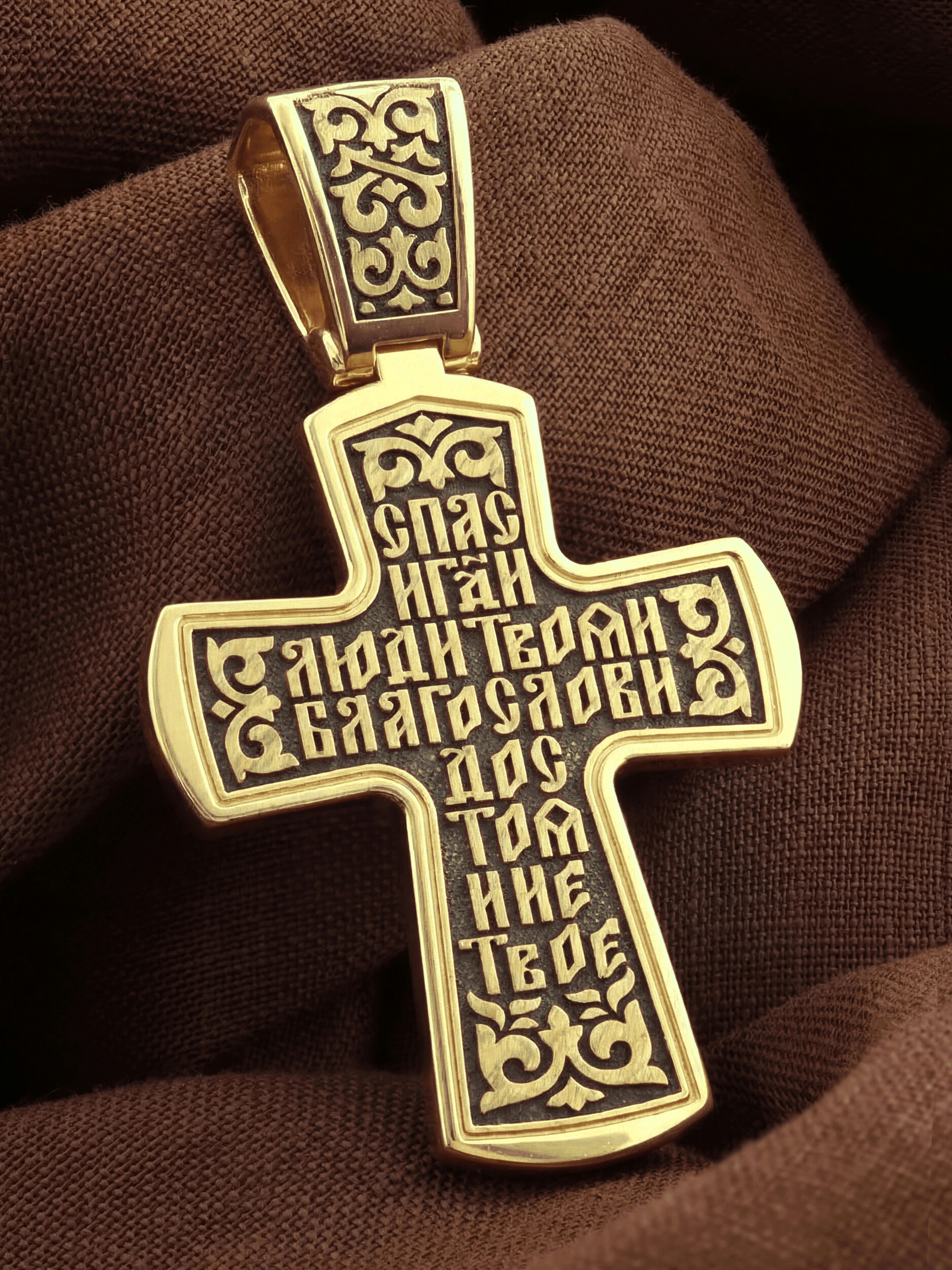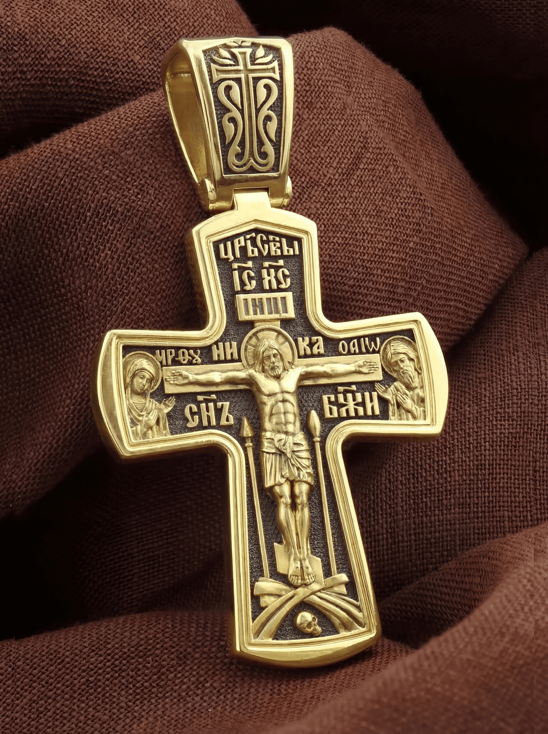 На лицевой стороне креста изображено Распятие Господа и Спасителя нашего Иисуса Христа, отдавшего Себя на смерть, для искупления грехов мира. Крест является символом жертвенной любви Всеблагого Бога к падшим людям, всепобеждающим духовным оружием христиан, основанием и средоточием церковной жизни. Господь сказал: «кто хочет идти за Мною, отвергнись себя, и возьми крест свой, и следуй за Мною». (Мк. 8: 34). На кулонном кольце изображен процветший крест. На верхней табличке, выше головы Иисуса, расположена надпись, составленная Понтием Пилатом — «IНЦI». Она означает «Иисус Назорей, Царь Иудейский». Распятие сопровождается каноническими надписями. Выше Распятия помещена надпись «Царь Славы» и надпись «IC» «ХC», означает Иисус Христос. Слово «НИКА», что означает «победитель» и надпись «Сын Божий», что означает божественную природу Иисуса Христа, помещаются на разных сторонах поперечной перекладины креста. Слева от Распятия изображена Пресвятая Богородица, справа — Про¬рок Предтеча и Креститель Господень Иоанн. Вдоль креста помещены Орудия Страстей Господних — копие сотника Лонгина и трость с губкой. Крест стоит на горе камней, символизирующих Голгофу. В ее основании различается череп– это голова Адама. На православном кресте Христос не умирает, а свободно простирает руки, ладони Иисуса открыты, будто он хочет обнять все человечество, даря им свою любовь и открывая путь к вечной жизни.