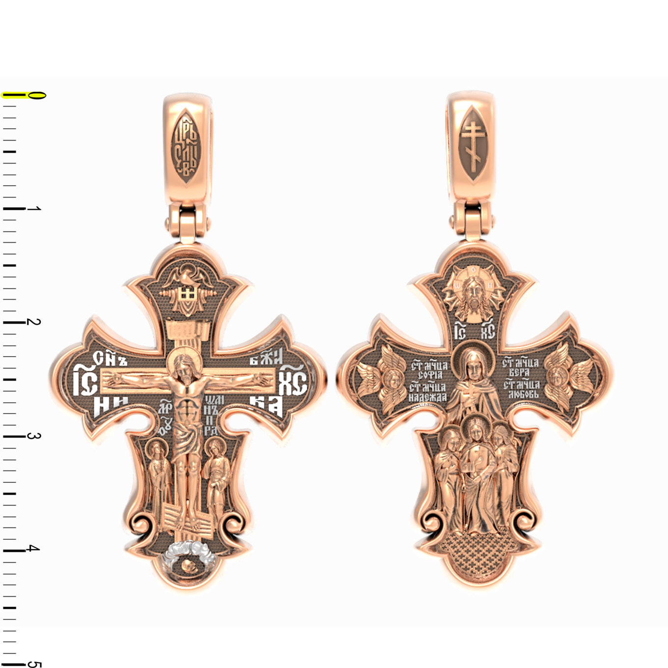 На оборотной стороне креста изображены Святые мученицы Вера, Надежда, Любовь и матерь их София, жившие во 2 веке нашей эры в Римской империи. Известно, что София была родом из Милана. Она рано овдовела, после чего перебралась в Рим. Своих дочерей София воспитывала в христианской вере и даже дала им имена в честь главных христианских добродетелей — Вера, Надежда и Любовь. В те годы римское государство жестоко преследовало верующих во Христа. Маленьких девочек (старшей Вере тогда было всего 12, а младшей Любови лишь 9) арестовали, подвергли истязаниям, а затем умертвили на глазах их матери. Сама София скончалась на следующий день у могилы своих дочерей. Но трагическая судьба на земле обернулась для мучениц вечной славой в ином мире. Церковь причислила их к лику святых и сегодня по молитвам к ним происходят чудеса. Выше образов мучениц изображен Спас Нерукотворный — образ Господа и Спасителя нашего Иисуса Христа, чудесно отпечатавшийся на плате, котором Христос вытер свой лик. По обеим сторонам креста изображены Ангелы Серафимы. На кулонном кольце помещен крест.