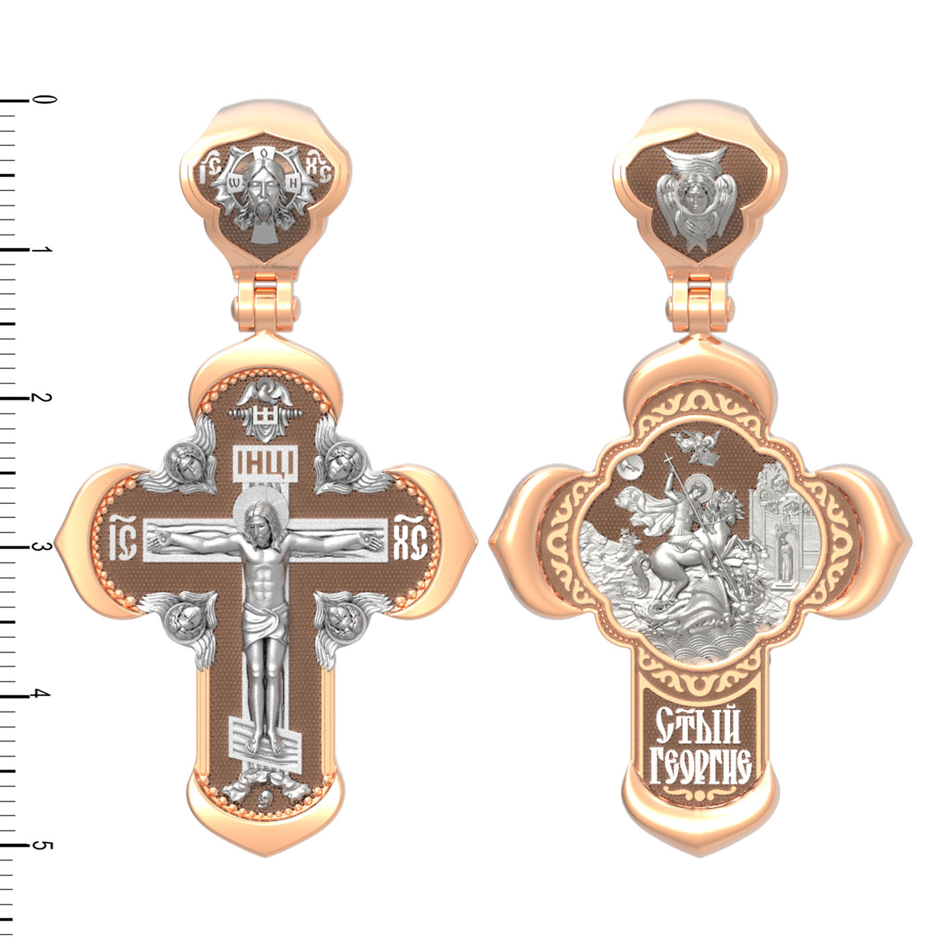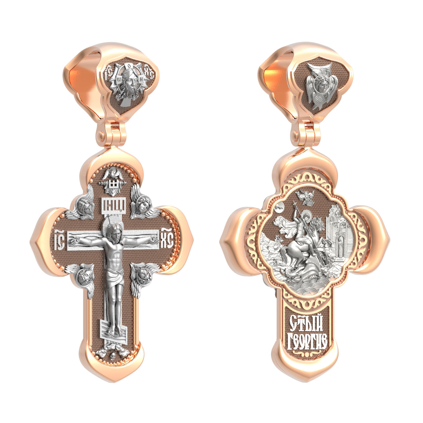 На оборотной стороне креста помещено изображение Святого Великомученика Георгия Победоносца — одного из самых почитаемых и удивительных святых. Георгий родился в Каппадокии (Малая Азия) в семье богатых и знатных горожан. Юношей поступил на службу к римскому императору Диоклетиану, за отличное знание военного дела и проявленную в боях и походах храбрость был приближен к императору и удостоен высокого воинского звания. Во время начавшихся гонений на христиан, перешел на сторону гонимых и, отвергнув человеческий страх, стал ярым проповедником учения Христа. Мучители подвергли опального воеводу жесточайшим восьмидневным пыткам и казнили его (обезглавили) в возрасте около тридцати лет в 303 году. Георгий изображен как воитель, сидящий на вздыбленном коне и поражающий копьем огнедышащего змея. Слева над образом изображена благословляющая Божия десница. Над святым изображен ангел возлагающий на него венец мученика. Змей символизирует собою сатанинские силы. Молитвами вознесенными к Всевышнему и своей непреклонной верой он смог одолеть чудовище. Святой убил змея, спас царскую дочь, принесенную в жертву, и жителей города, их души от влияния дьявола, породив в них надежду и веру в Господа, призывая людей принять христианскую веру. На кулонном кольце изображен шестикрылый Ангел — Серафим.