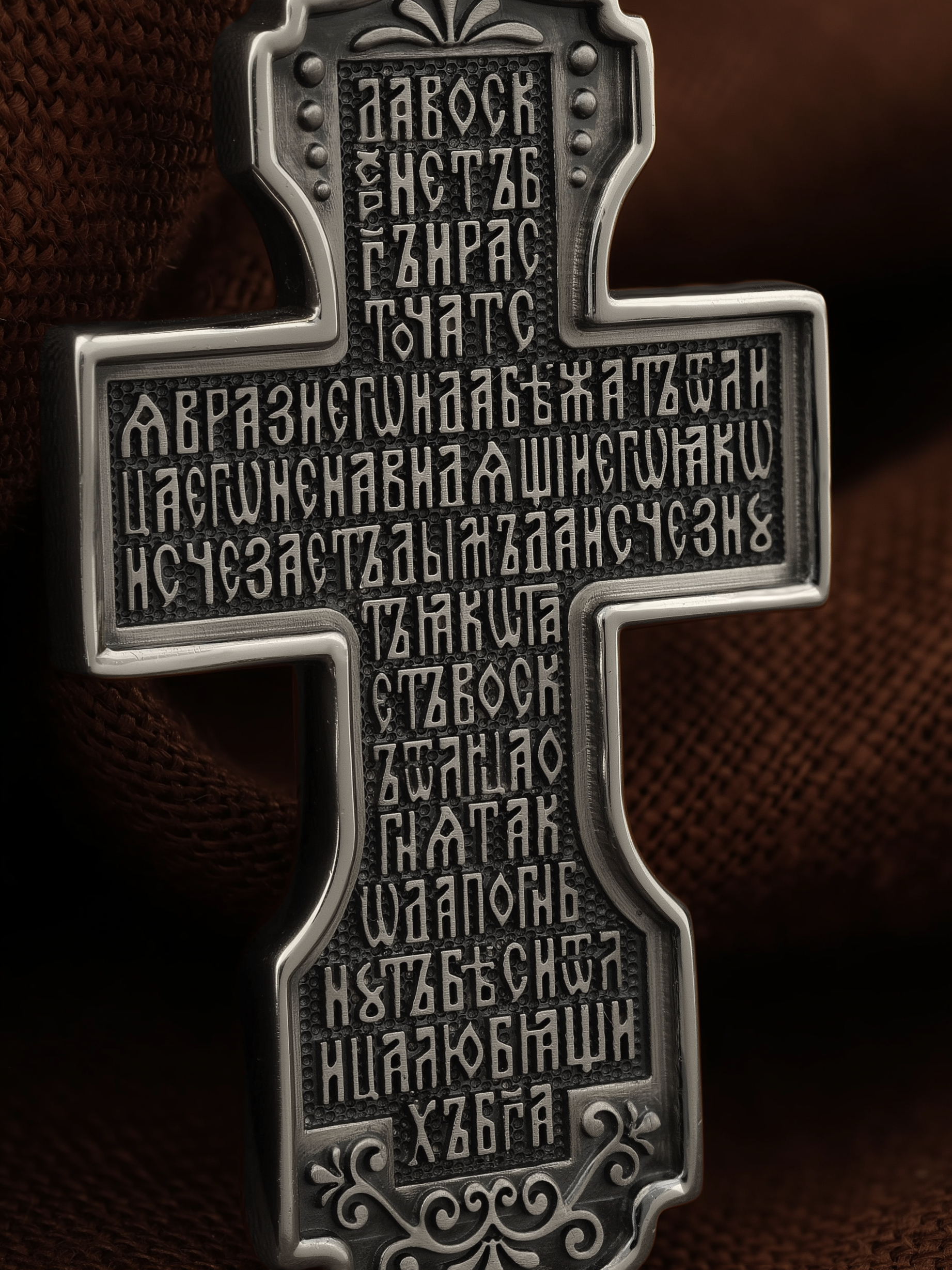 На оборотной стороне креста помещена молитва Честному Кресту Господню: «Да воскреснет Бог, и расточатся врази Его, и да бежат от лица Его ненавидящии Его. Яко исчезает дым, да исчезнут; яко тает воск от лица огня, тако да погибнут беси от лица любящих Бога…». На кулонном кольце изображен шестикрылый Серафим.