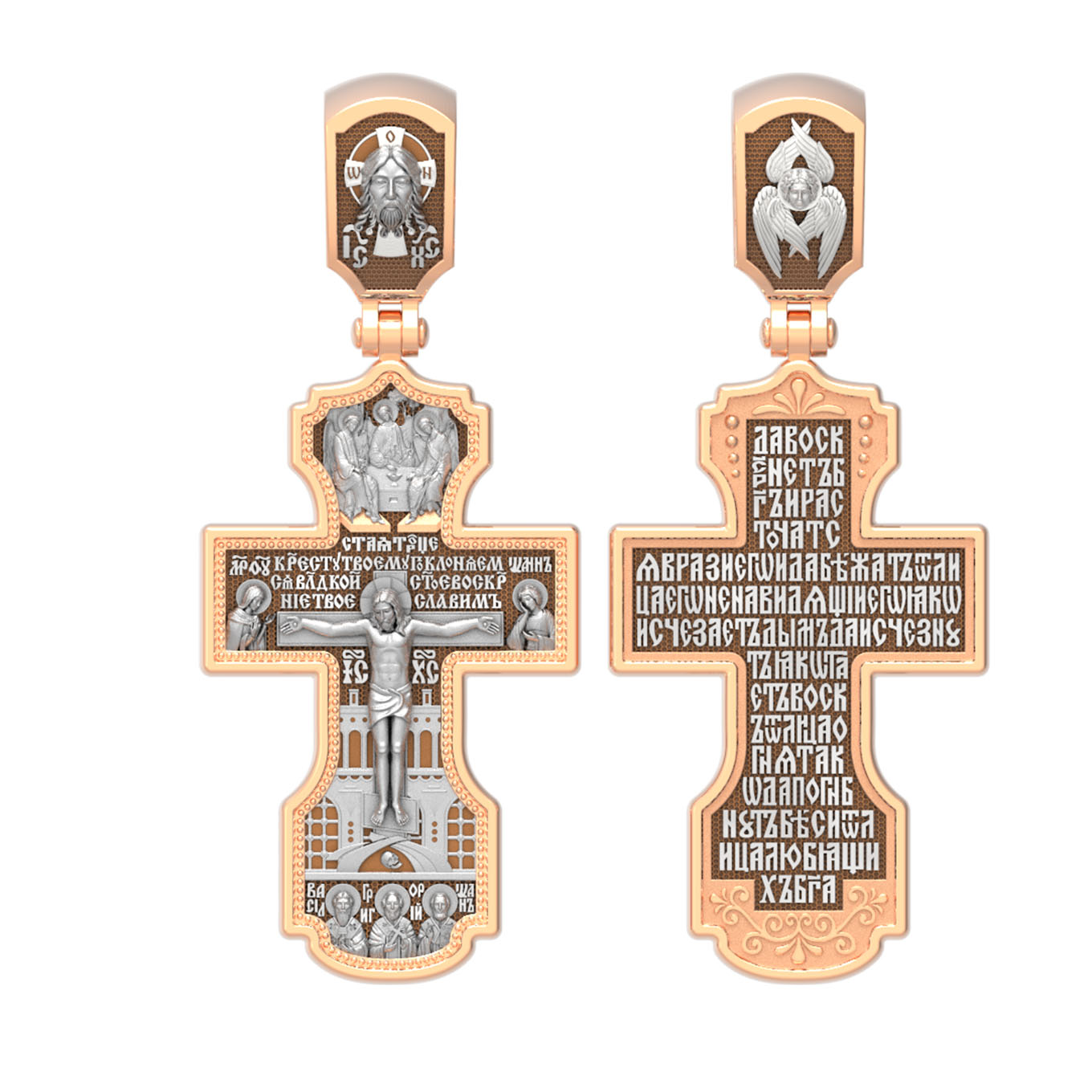 На лицевой стороне креста изображено Распятие Господа и Спасителя нашего Иисуса Христа, отдавшего Себя на смерть, для искупления грехов мира. Крест является символом жертвенной любви Всеблагого Бога к падшим людям, всепобеждающим духовным оружием христиан, основанием и средоточием церковной жизни. Господь сказал: «кто хочет идти за Мною, отвергнись себя, и возьми крест свой, и следуй за Мною». (Мк. 8: 34). Выше Распятия помещены слова молитвы:"Кресту Твоему поклоняемся, Владыко, и святое Воскресение Твое Славим». Над Распятием — образ Святой Троицы в виде трех ангелов. Надпись «IС» « ХС» означает Иисус Христос и находится ниже поперечной перекладины креста. Слева от Распятия изображена Пресвятая Богородица. Справа — апостол и евангелист Иоанн Богослов, один из ближайших учеников Иисуса Христа. За крестом высится Иерусалимская стена. Крест стоит на горе камней, символизирующих Голгофу. В ее основании различается череп — это голова Адама. Ниже распятия изображены отцы Церкви — Святители Василий Великий, Григорий Богослов и Иоанн Златоуст. На православном кресте Христос не умирает, а свободно простирает руки, ладони Иисуса открыты, будто он хочет обнять все человечество, даря им свою любовь и открывая путь к вечной жизни. На кулонном кольце изображен Нерукотворный образ Господа и Спасителя нашего Иисуса Христа, чудесно отпечатавшийся на плате, которым Христос вытер свой лик.