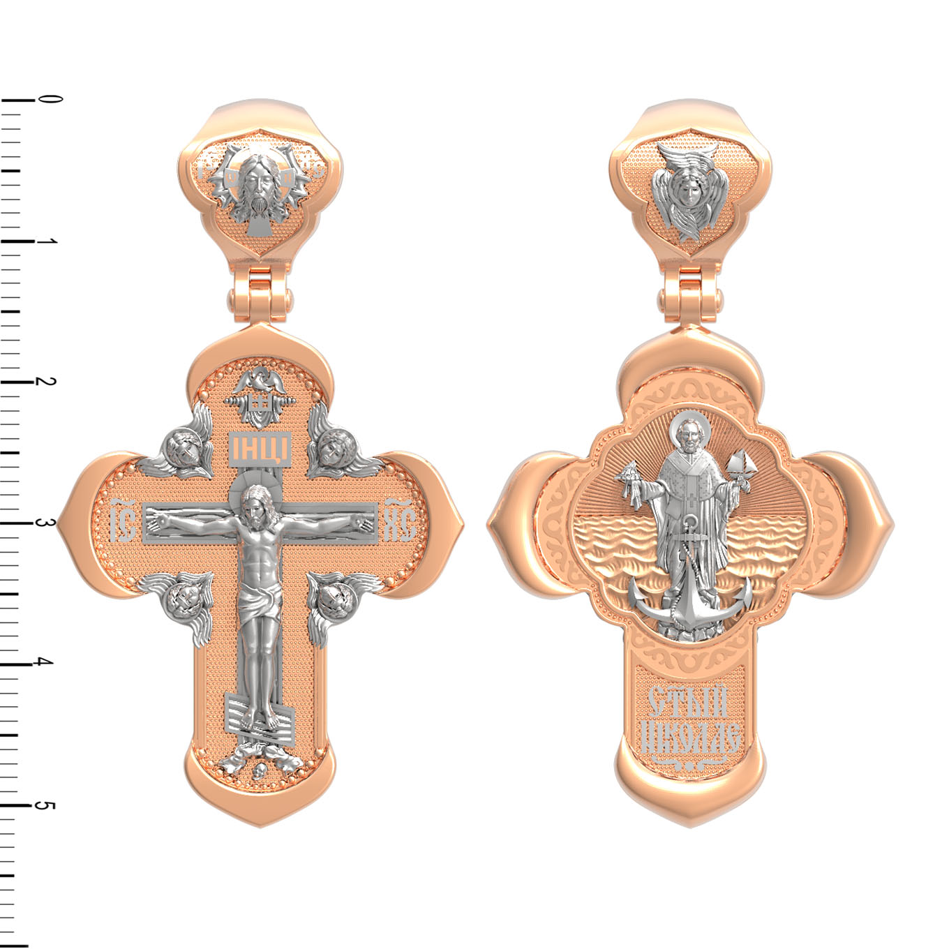 На лицевой стороне креста изображено Распятие Господа и Спасителя нашего Иисуса Христа, отдавшего Себя на смерть, для искупления грехов мира. Крест является символом жертвенной любви Всеблагого Бога к падшим людям, всепобеждающим духовным оружием христиан, основанием и средоточием церковной жизни. Господь сказал: «кто хочет идти за Мною, отвергнись себя, и возьми крест свой, и следуй за Мною». (Мк. 8: 34). На верхней табличке, выше головы Иисуса, расположена надпись, составленная Понтием Пилатом — «IНЦI». Она означает «Иисус Назорей, Царь Иудейский». Надпись «IC» «ХC», означает Иисус Христос, помещается на разных сторонах поперечной перекладины креста. Крест стоит на горе камней, символизирующих Голгофу. В ее основании различается череп– это голова Адама. На кулонном кольце изображен Нерукотворный образ Господа и Спасителя нашего Иисуса Христа, чудесно отпечатавшийся на плате, которым Христос вытер свой лик.