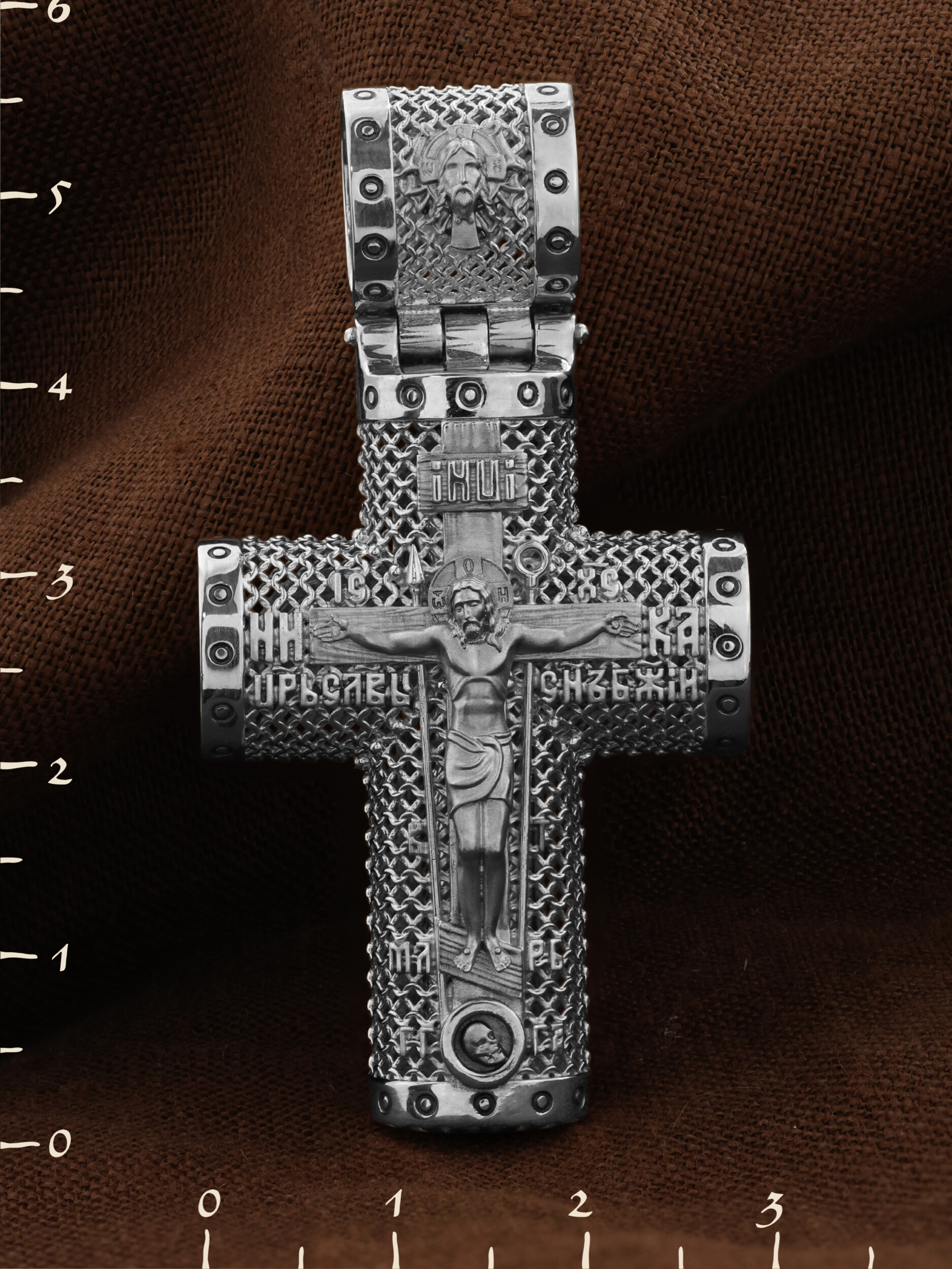 На лицевой стороне креста изображено Распятие Господа и Спасителя нашего Иисуса Христа. Крест- символ спасения и искупления рода человеческого, знамение победы над смертью и адом. Иисус Христос, как искупительная жертва освобождения человечества от власти греха, умер крестной смертью и в третий день воскрес. Распятие сопровождается каноническими надписями. На верхней табличке, выше головы Иисуса, расположена надпись, составленная Понтием Пилатом — «IНЦI». Она означает «Иисус Назорей, Царь Иудейский». Надписи «IC» «ХC», означает Иисус Христос, «НИКА», что означает Победитель, «Царь Славы» и «Сын Божий», размещается на разных сторонах поперечной перекладины креста. Крест стоит на горе камней, символизирующих Голгофу, которая обозначена надписью «Г Г». В ее основании различается череп — это голова Адама, обозначенный надписью «Г А». Надпись «МЛРБ» — «место лобное рай бысть» означает место лобное стало раем. Вдоль креста изображены орудия Страстей Христовых: копие сотника Лонгина, которым пронзили подреберье мёртвого Иисуса, чтобы убедиться в Его смерти, и трость с губкой, с которой Иисуса напоили уксусом. Они обозначены буквами «К» и «Т». На кулонном кольце размещен «Нерукотворный образ Иисуса Христа», на оборотной стороне кулонного кольца- шестикрылый Серафим.