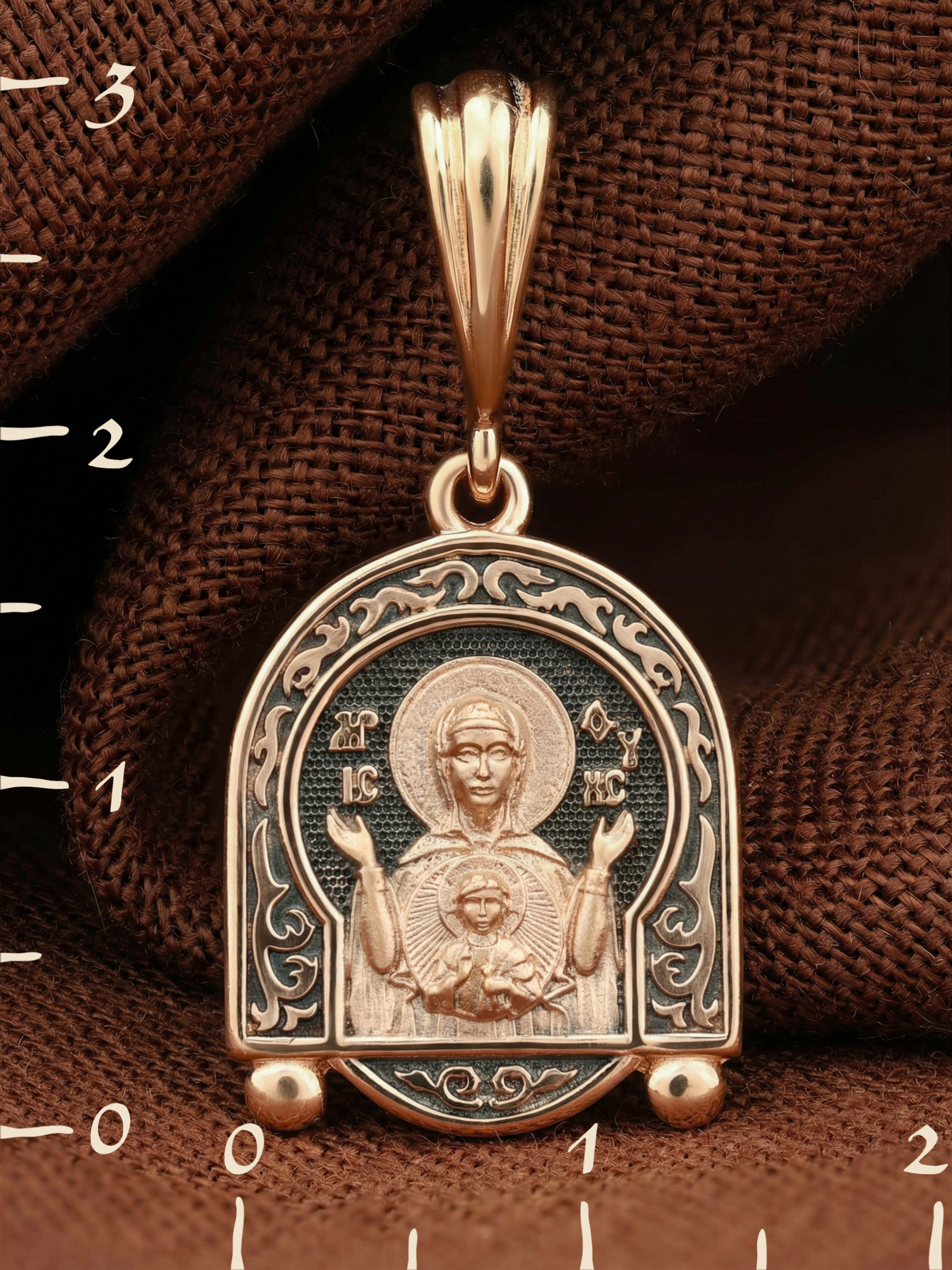 В центр образка помещен образ Божией Матери «Знамение», прославившийся многими чудесами в Новгороде в XII веке. Икона эта чтится как одна из самых великих святынь Русской земли. Молитвенно воздетые руки Богородицы означают заступничество за людей пред Богом. Рядом с Ней, на фоне круглого щита, — благословляющий Божественный Младенец — Спас-Эммануил.
