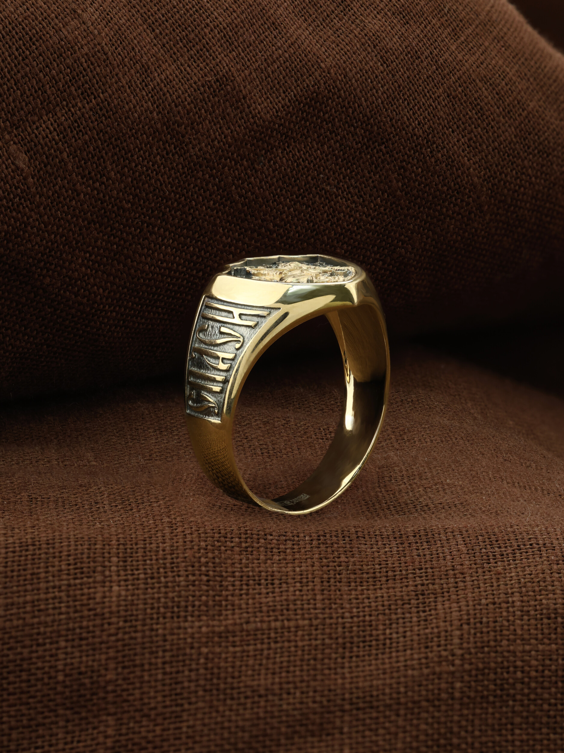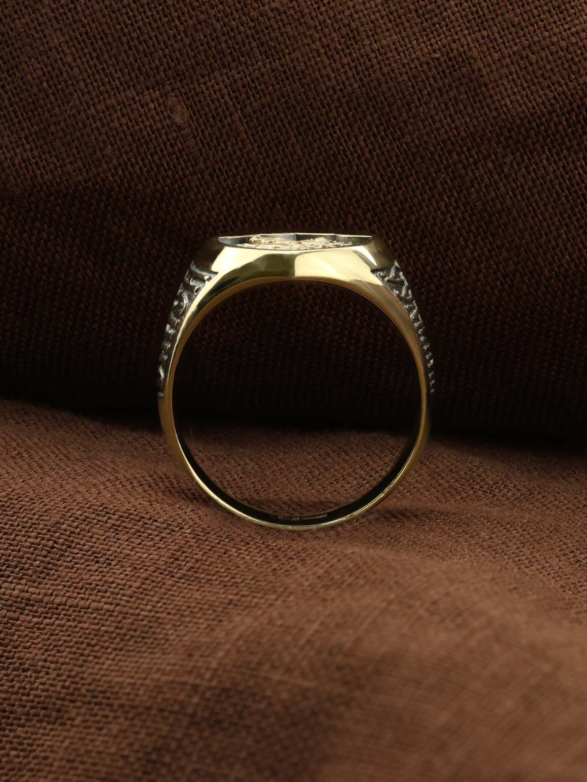 Кольцо «Святой Великомученик Георгий Победоносц» выполнено в древних христианских традициях. Основой композиции является изображение Святого Великомученика Георгия Победоносца — одного из самых почитаемых и удивительных святых. Георгий родился в Каппадокии (Малая Азия) в семье богатых и знатных горожан. Юношей поступил на службу к римскому императору Диоклетиану, за отличное знание военного дела и проявленную в боях и походах храбрость был приближен к императору и удостоен высокого воинского звания. Во время начавшихся гонений на христиан, перешел на сторону гонимых и, отвергнув человеческий страх, стал ярым проповедником учения Христа. Мучители подвергли опального воеводу жесточайшим восьмидневным пыткам и казнили его (обезглавили) в возрасте около тридцати лет в 303 году. На Руси он известен как Юрий или Егорий, заступник для верующих, чья жизнь имеет какое-либо отношение к военным делам, помощник в крестьянском труде. Георгий изображен как воитель, сидящий на вздыбленном коне и поражающий копьем огнедышащего змея. Справа над образом изображена благословляющая Божия десница. Змей символизирует собою сатанинские силы. Молитвами вознесенными к Всевышнему и своей непреклонной верой он смог одолеть чудовище. Святой убил змея, спас царскую дочь, принесенную в жертву, и жителей города, их души от влияния дьявола, породив в них надежду и веру в Господа, призывая людей принять христианскую веру.