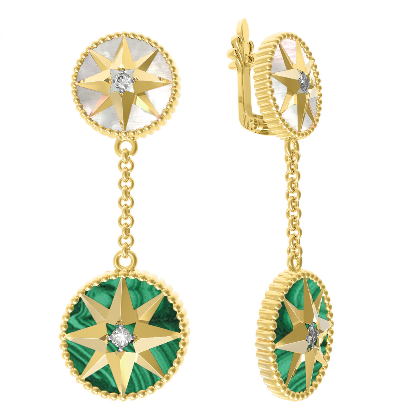 Серьги из лимонного золота c фианитом, малахитом и перламутром