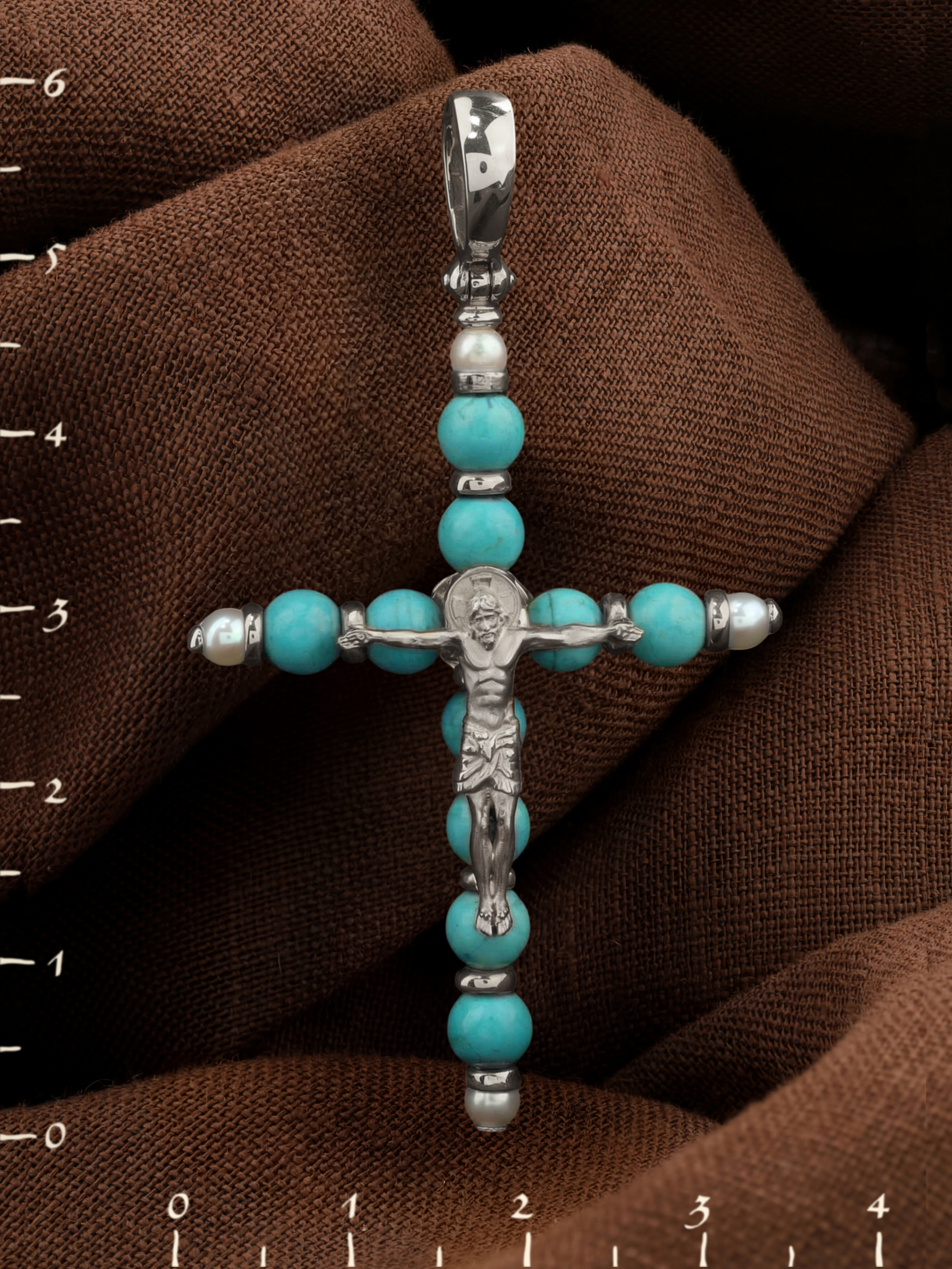 На лицевой стороне креста изображено Распятие Господа и Спасителя нашего Иисуса Христа. Своими крестными страданиями Господь смыл наши грехи, покрыл наш долг перед Богом или, на языке Писания, нас «искупил». В Голгофе сокрыта непостижимая тайна бесконечной правды и любви Бога. Крест стал символом победы добра над злом, жизни над смертью, напоминанием бесконечной Божьей любви, предметом радости. Воплотившийся Сын Божий Своею кровью освятил крест и сделал его проводником Своей благодати, источником освящения верующих. На верхней табличке, выше головы Иисуса, расположена надпись, составленная Понтием Пилатом — «IНЦI». Она означает «Иисус Назорей, Царь Иудейский». Надпись «IC» «ХC», означает Иисус Христос, помещаются на разных сторонах поперечной перекладины креста. Христос в Своей Божественной любви, над которой смерть не властна и которая, страдая, и не страдает в обычном смысле, простирает к людям со Креста Свои объятия, в которые призывается и привлекается весь мир. Поэтому Тело Его не висит, а торжественно покоится на Кресте.