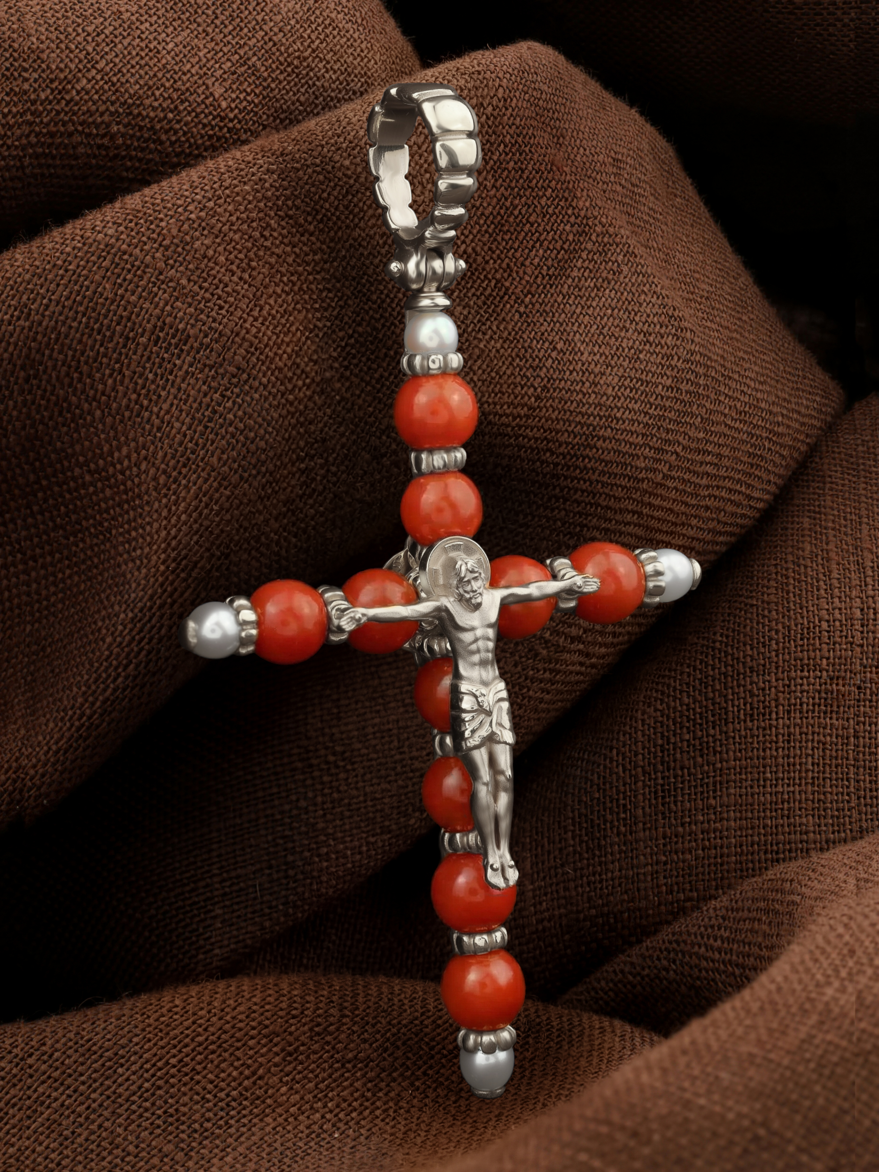 Крест из белого золота c жемчугом и кораллом
