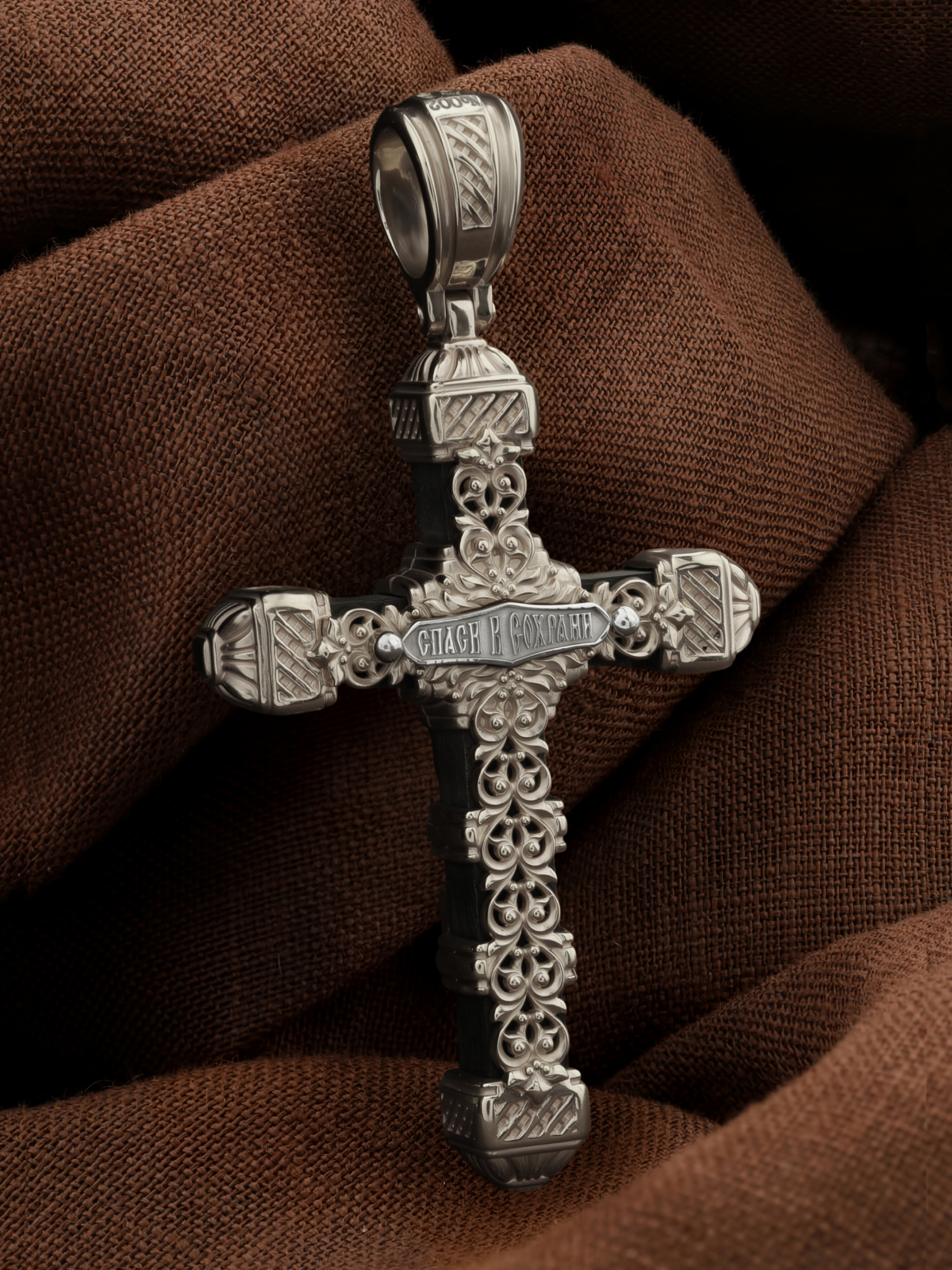 На оборотной стороне креста помещена молитва: «Спаси и сохрани». Крест украшен орнаментом.