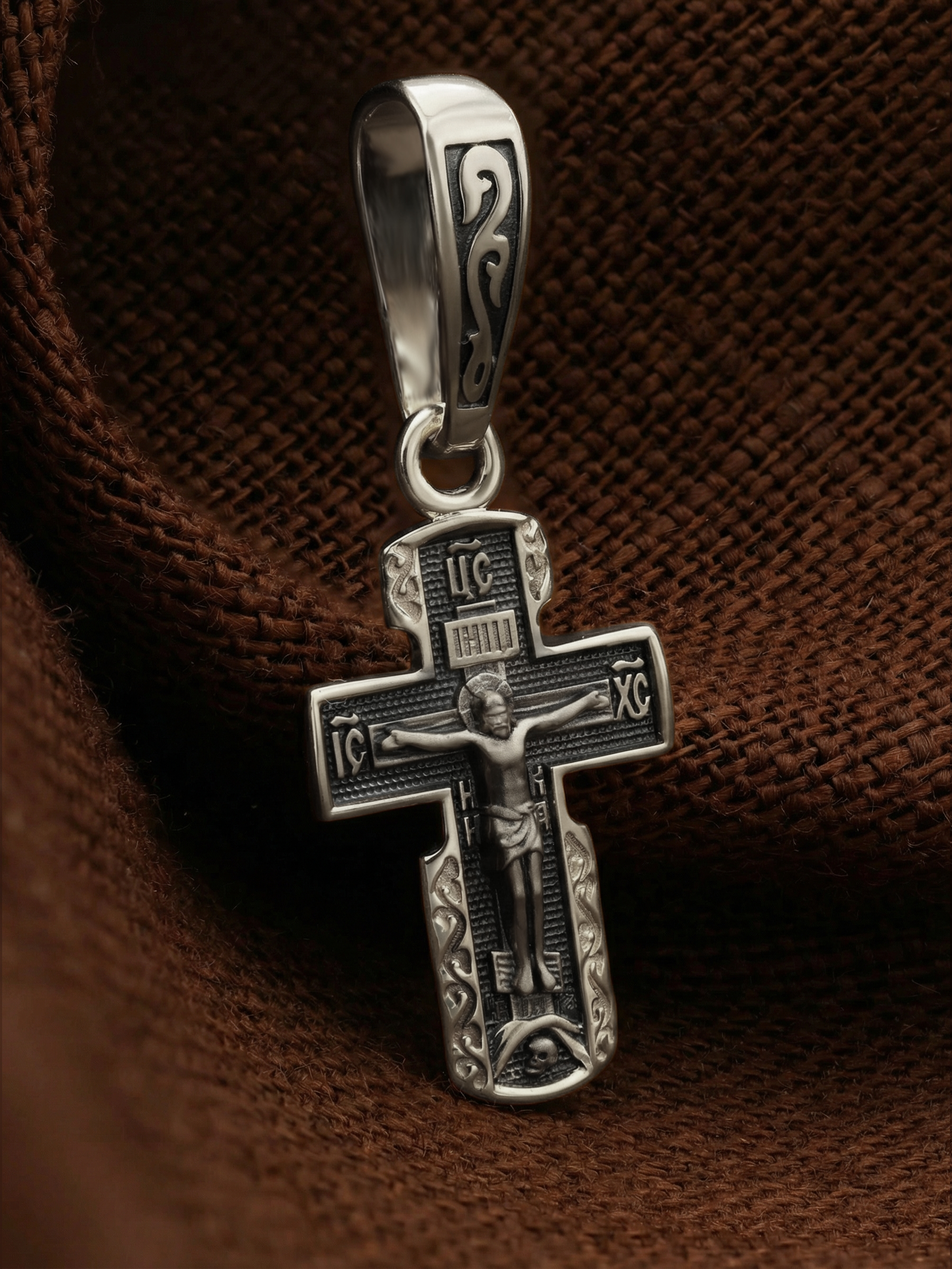 На лицевой стороне креста изображено Распятие Господа и Спасителя нашего Иисуса Христа, отдавшего Себя на смерть, для искупления грехов мира. Крест является символом жертвенной любви Всеблагого Бога к падшим людям, всепобеждающим духовным оружием христиан, основанием и средоточием церковной жизни. Над вершиной Распятия помещена надпись «Царь Славы». На верхней перекладине расположена надпись «IНЦI». Она символизирует титло — табличку, на которой, согласно Евангелию, было начертано: Иисус Назорей, Царь Иудейский. Надпись «IC» «ХC», означает Иисус Христос, помещаются на разных сторонах поперечной перекладины креста. Ниже помещена надпись «НИКА», что означает «победитель». Крест стоит на горе камней, символизирующих Голгофу. В ее основании различается череп и надписи «Г.А.» — голова Адама, «Г.Г.» — гора Голгофа.