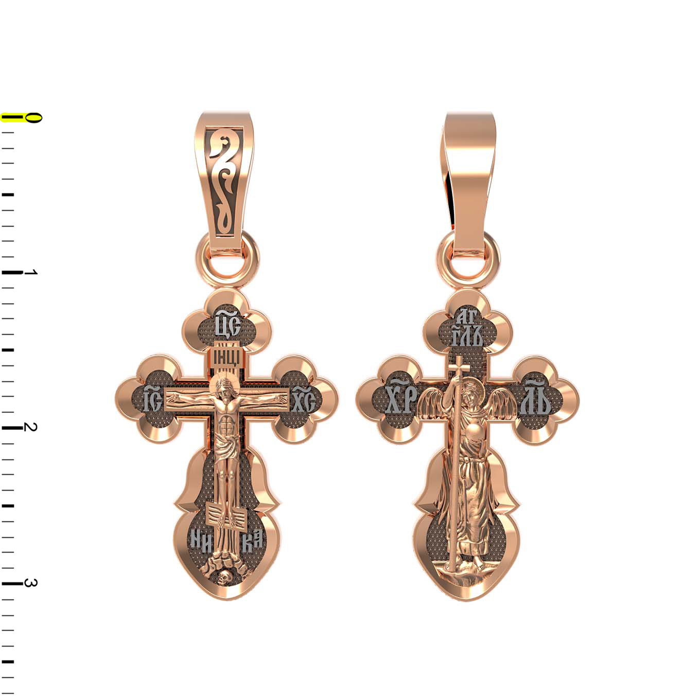 На оборотной стороне креста изображен святой Ангел-Хранитель в виде прекрасного юноши держащего в правой руке крест, а в левой — сферу. Ангел-Хранитель — это Ангел приставляемый Богом к человеку при крещении для охраны и помощи в добрых делах. Невидимо пребывая при нас постоянно, он, руководствуя нас ко спасению, не только по нашему желанию таинственно наставляет нас на все доброе и полезное, не только возносит наши молитвы к Богу, но еще и сам от себя охраняют и защищают нас от врагов видимых и невидимых, ходатайствует за нас пред Богом.