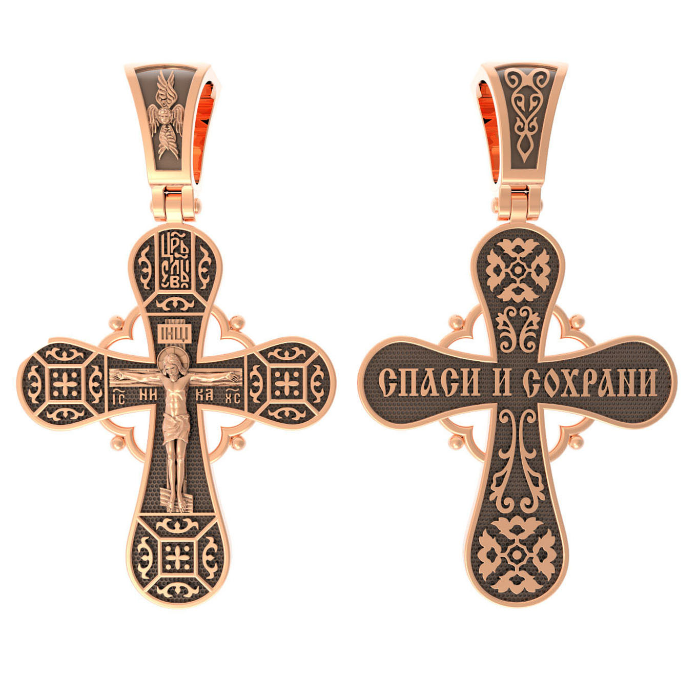 На лицевой стороне креста изображено Распятие, потому что это орудие казни Иисус Христос сделал орудием победы над грехом и смертью. Своими страданиями Он искупил грехи человечества, умерев и сошествовав во ад, победил сатану, освободил души праведников от вечной смерти и открыл им небесные врата рая. Жертва Христа сделала возможным спасение для каждого человека. На православном кресте Христос не умирает, а свободно простирает руки, ладони Иисуса открыты, будто он хочет обнять все человечество, даря им свою любовь и открывая путь к вечной жизни. Над титлом видим слова «ЦРЬ СЛВЫ» — Царь Славы. Верхняя перекладина символизирует собой табличку с надписью «IHЦI» — Иисус Назарянин Царь Иудейский. Под перекладиной пишется сокращенно имя Спасителя «IC XC» — Иисус Христос, рядом добавляется: «НИКА» (греч. — Победитель). Возвышение, на котором стоит Крест, символизирует гору Голгофу, на которой произошло Распятие. У подножия Креста изображают прах Адама, обозначенный черепом.
