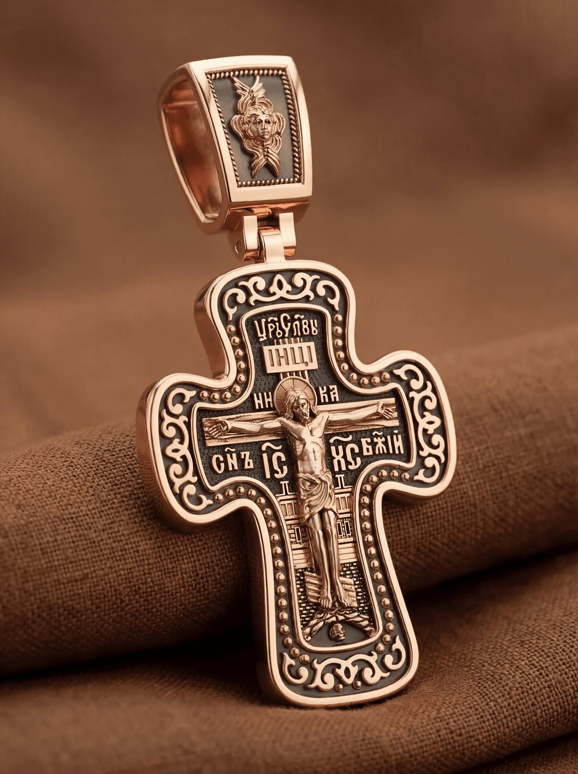 На лицевой стороне креста изображено Распятие, потому что это орудие казни Иисус Христос сделал орудием победы над грехом и смертью. Своими страданиями Он искупил грехи человечества, умерев и сошествовав во ад, победил сатану, освободил души праведников от вечной смерти и открыл им небесные врата рая. Жертва Христа сделала возможным спасение для каждого человека. На православном кресте Христос не умирает, а свободно простирает руки, ладони Иисуса открыты, будто он хочет обнять все человечество, даря им свою любовь и открывая путь к вечной жизни. Над титлом видим слова «ЦРЬ СЛВЫ» — Царь Славы. Верхняя перекладина символизирует собой табличку с надписью «IHЦI» — Иисус Назарянин Царь Иудейский. Над перекладиной пишется слово «НИКА» (греч. — Победитель), ниже перекладины добавляется сокращенно имя Спасителя «IC XC» — Иисус Христос и словосочетание «СНЪ БЖIЙ» — Сын Божий. Возвышение, на котором стоит Крест, символизирует гору Голгофу, на которой произошло Распятие. У подножия Креста изображают прах Адама, обозначенный черепом. На кулонном кольце изображен шестикрылый Серафим — самый приближенный к Господу Ангел.