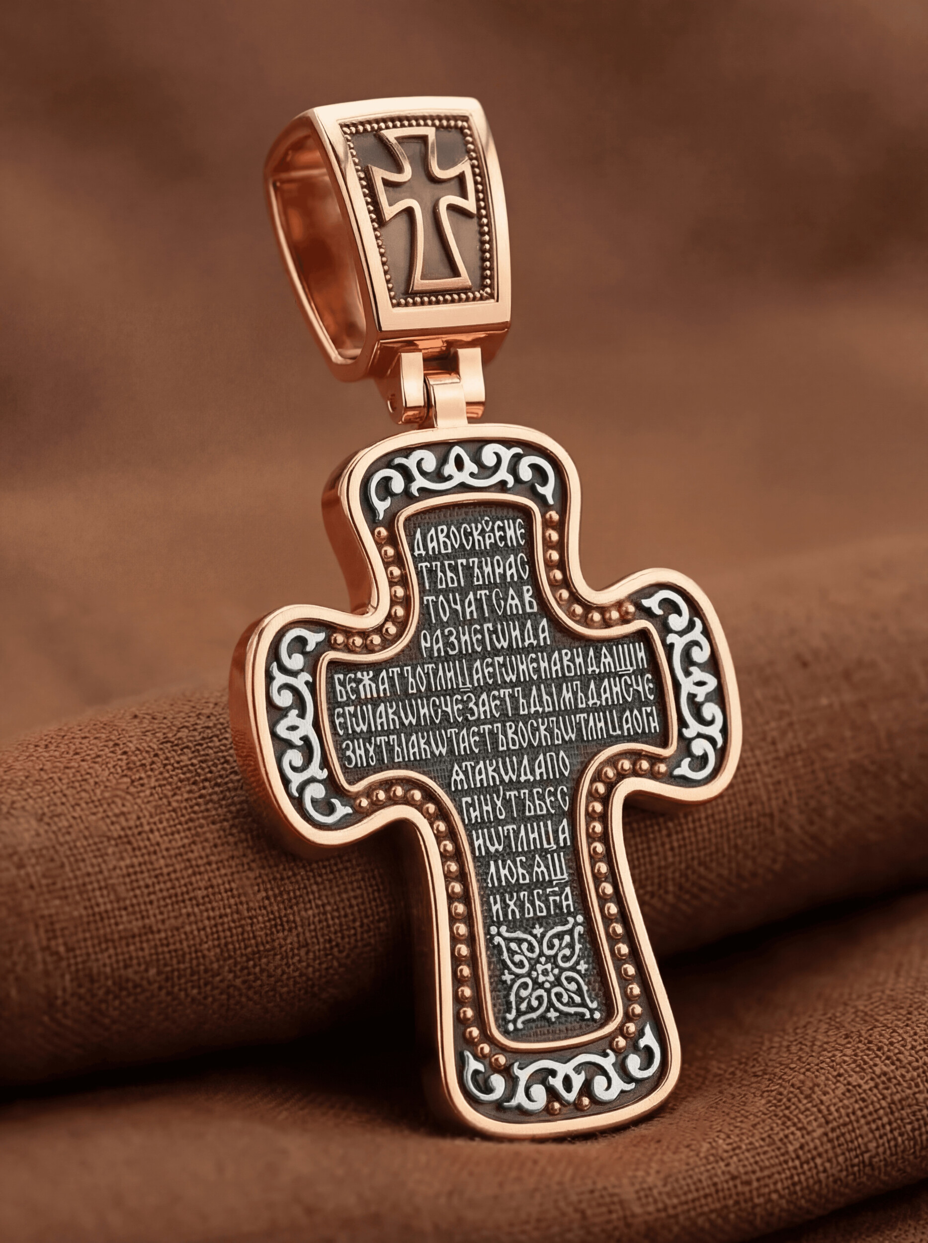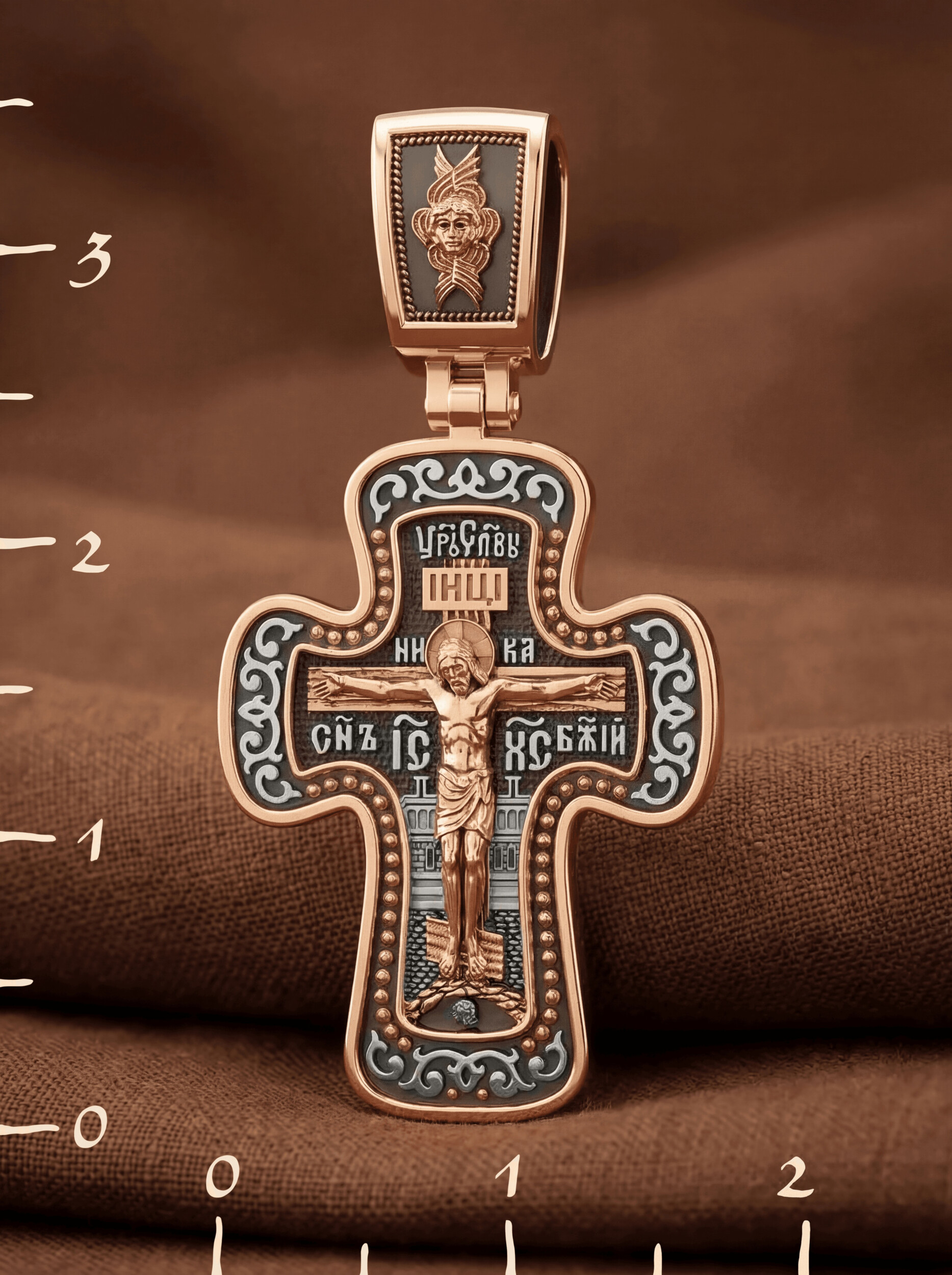 На лицевой стороне креста изображено Распятие, потому что это орудие казни Иисус Христос сделал орудием победы над грехом и смертью. Своими страданиями Он искупил грехи человечества, умерев и сошествовав во ад, победил сатану, освободил души праведников от вечной смерти и открыл им небесные врата рая. Жертва Христа сделала возможным спасение для каждого человека. На православном кресте Христос не умирает, а свободно простирает руки, ладони Иисуса открыты, будто он хочет обнять все человечество, даря им свою любовь и открывая путь к вечной жизни. Над титлом видим слова «ЦРЬ СЛВЫ» — Царь Славы. Верхняя перекладина символизирует собой табличку с надписью «IHЦI» — Иисус Назарянин Царь Иудейский. Над перекладиной пишется слово «НИКА» (греч. — Победитель), ниже перекладины добавляется сокращенно имя Спасителя «IC XC» — Иисус Христос и словосочетание «СНЪ БЖIЙ» — Сын Божий. Возвышение, на котором стоит Крест, символизирует гору Голгофу, на которой произошло Распятие. У подножия Креста изображают прах Адама, обозначенный черепом. На кулонном кольце изображен шестикрылый Серафим — самый приближенный к Господу Ангел.
