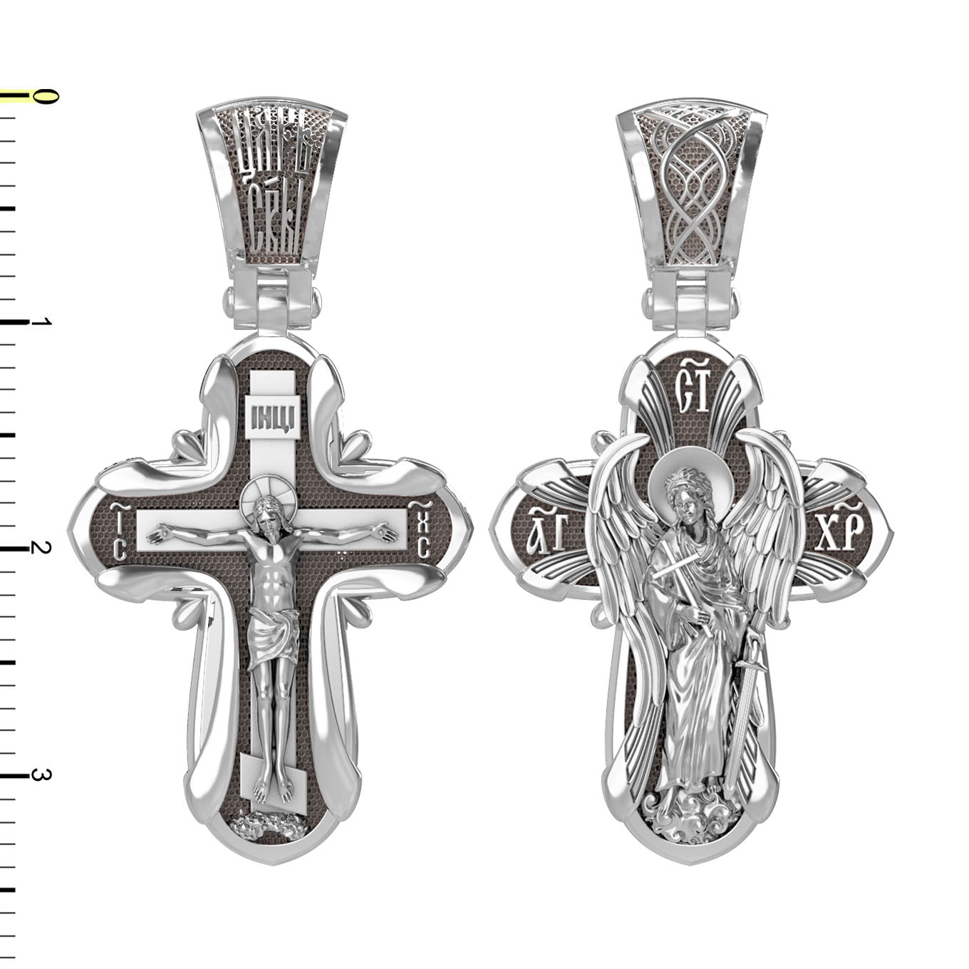На оборотной стороне креста изображен Святой Ангел-Хранитель держащий в правой руке крест, а в левой — мечь.. Ангел-Хранитель — это Ангел приставляемый Богом к человеку при крещении для охраны и помощи в добрых делах. Он невидимо находится при человеке на протяжении всей его жизни, если человек сохраняет в себе любовь к Богу и истинную веру перед Ним. Ангел-Xранитель делают для нас все, что служит к истинному нашему благу и спасению. Невидимо пребывая при нас постоянно, он, руководствуя нас ко спасению, не только по нашему желанию таинственно наставляет нас на все доброе и полезное, не только возносит наши молитвы к Богу, но еще и сам от себя охраняют и защищают нас от врагов видимых и невидимых и ходатайствует за нас пред Богом. Ангел-Хранитель так любит нас, как никто на земле любить не может. Ангел-Хранитель — присный друг наш, незримый тихий собеседник, пресладостный утешитель. Одного лишь каждому из нас он желает — спасения души; к этому он направляет все свои заботы. И если видит нас также заботящимися о спасении, радуется, если же видит нас пребывающими в нерадении о душе своей, скорбит. Но и самый великий грешник может примириться со своим Ангелом-Хранителем посредством искреннего раскаяния в грехах и оставления их навсегда. В таком случае, по слову Писания, великая радость бывает для всех ангелов на небесах (Лк. 15:10).