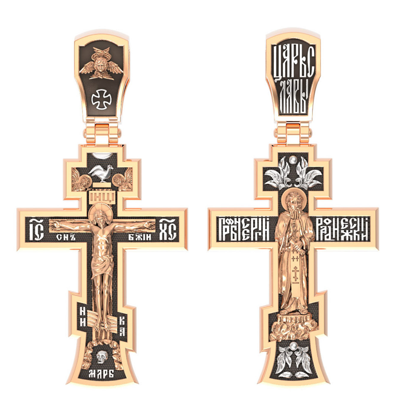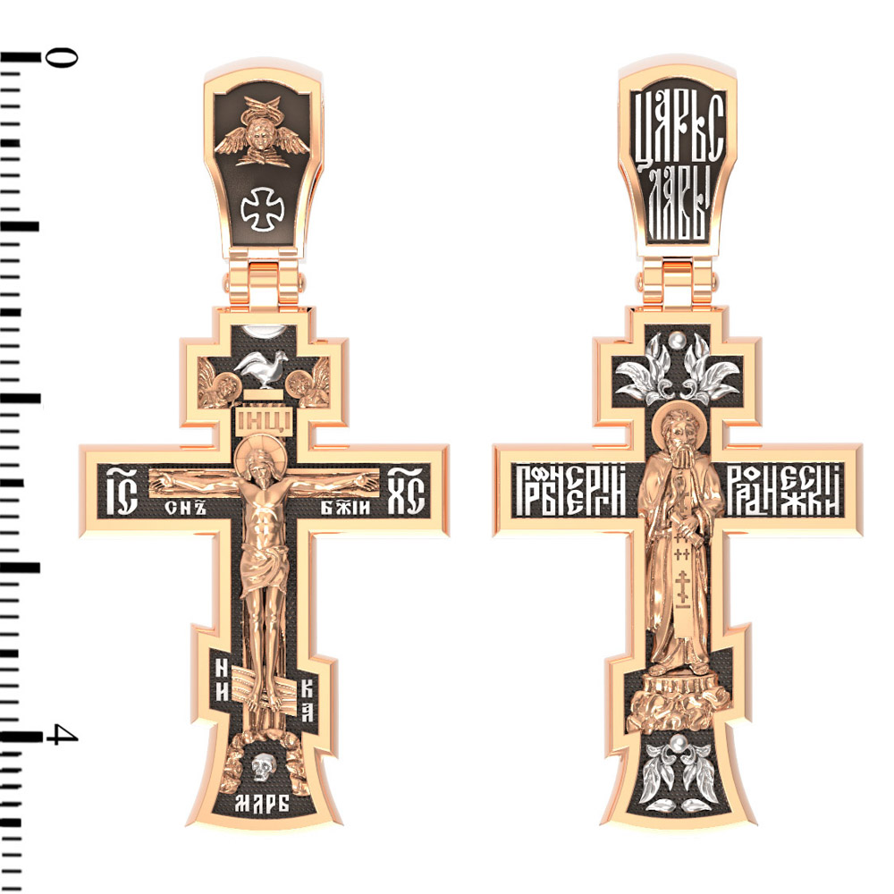 На лицевой стороне этого креста центральную часть занимает икона Распятия Христа — образ жертвы, принесенной Господом за грехи людей. Именно ко Христу, сошедшему на землю ради нашего спасения, возносятся все молитвы. Рядом с Его образом помещены слова — «НИКА» и «Сын Божий». Эти слова характеризуют Господа как Великого Архиерея, победителя смерти. Также Распятие сопровождается надписями, олицетворяющими Христа — это святое имя Христа «IC» (Иисус) «ХС» (Христос). На кулонном кольце написано «Царь Славы».