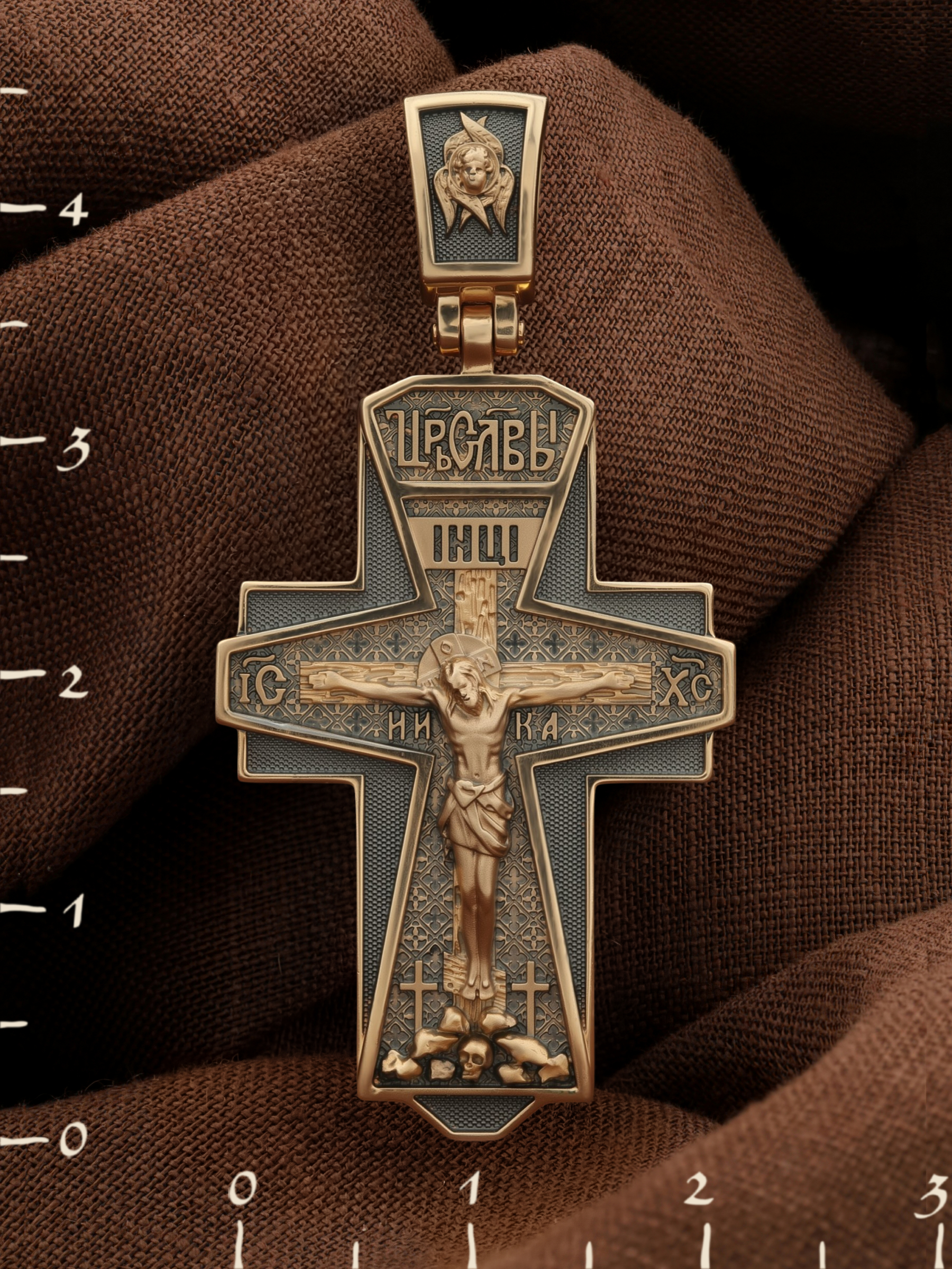 На лицевой стороне креста изображено Распятие, потому что это орудие казни Иисус Христос сделал орудием победы над грехом и смертью. Своими страданиями Он искупил грехи человечества, умерев и сошествовав во ад, победил сатану, освободил души праведников от вечной смерти и открыл им небесные врата рая. Жертва Христа сделала возможным спасение для каждого человека. На православном кресте Христос не умирает, а свободно простирает руки, ладони Иисуса открыты, будто он хочет обнять все человечество, даря им свою любовь и открывая путь к вечной жизни.
