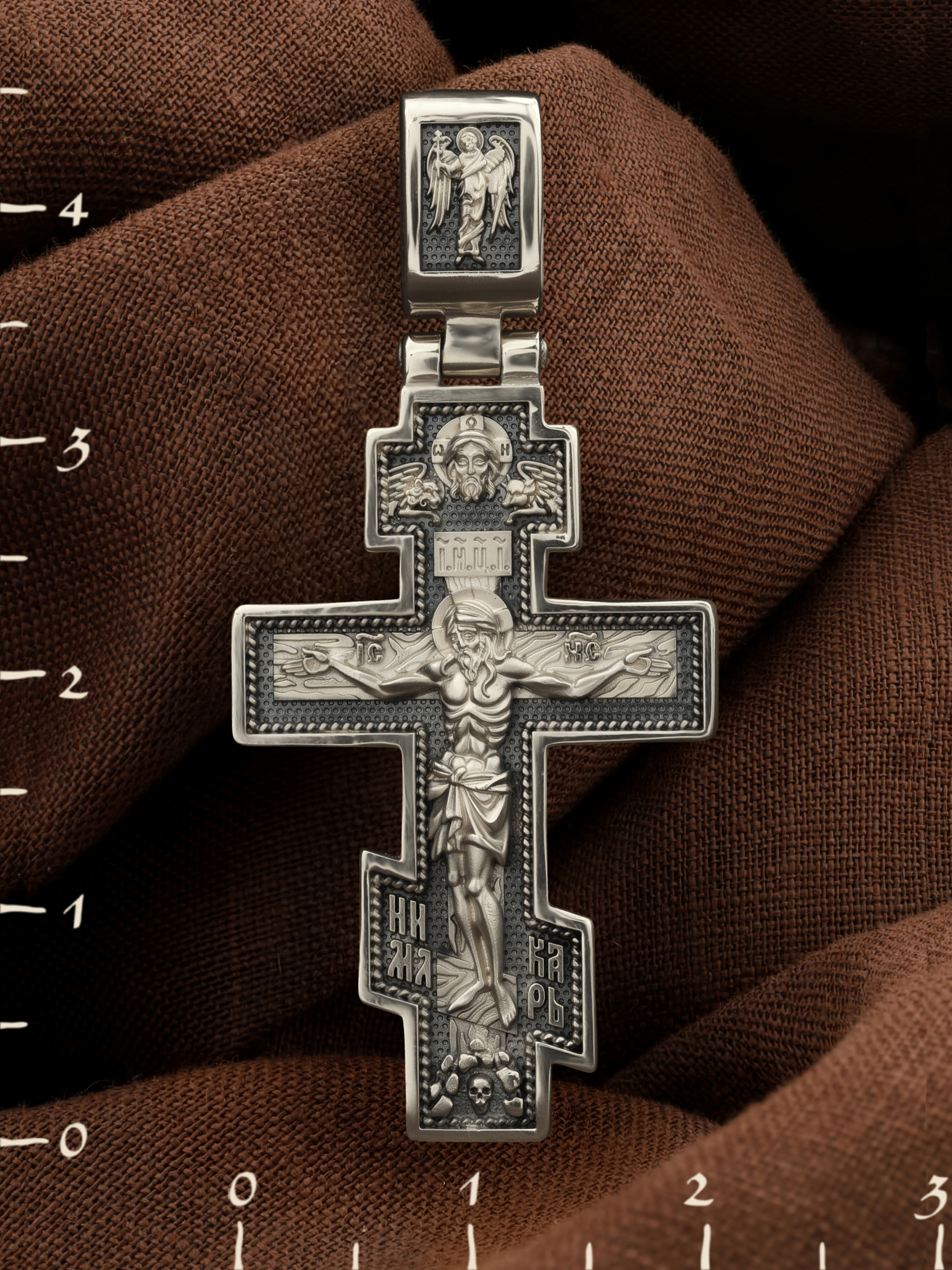 На лицевой стороне креста изображено Распятие, потому что это орудие казни Иисус Христос сделал орудием победы над грехом и смертью. Своими страданиями Он искупил грехи человечества, умерев и сошествовав во ад, победил сатану, освободил души праведников от вечной смерти и открыл им небесные врата рая. Жертва Христа сделала возможным спасение для каждого человека. На православном кресте Христос не умирает, а свободно простирает руки, ладони Иисуса открыты, будто он хочет обнять все человечество, даря им свою любовь и открывая путь к вечной жизни. Верхняя перекладина символизирует собой табличку с надписью «IHЦI» — Иисус Назарянин Царь Иудейский. У подножия добавляется: «НИКА» (греч. — Победитель) и «МЛРБ» — Место Лобное Рай Бысть. Возвышение, на котором стоит Крест, символизирует гору Голгофу, на которой произошло Распятие. У подножия Креста изображают прах Адама, обозначенный черепом.