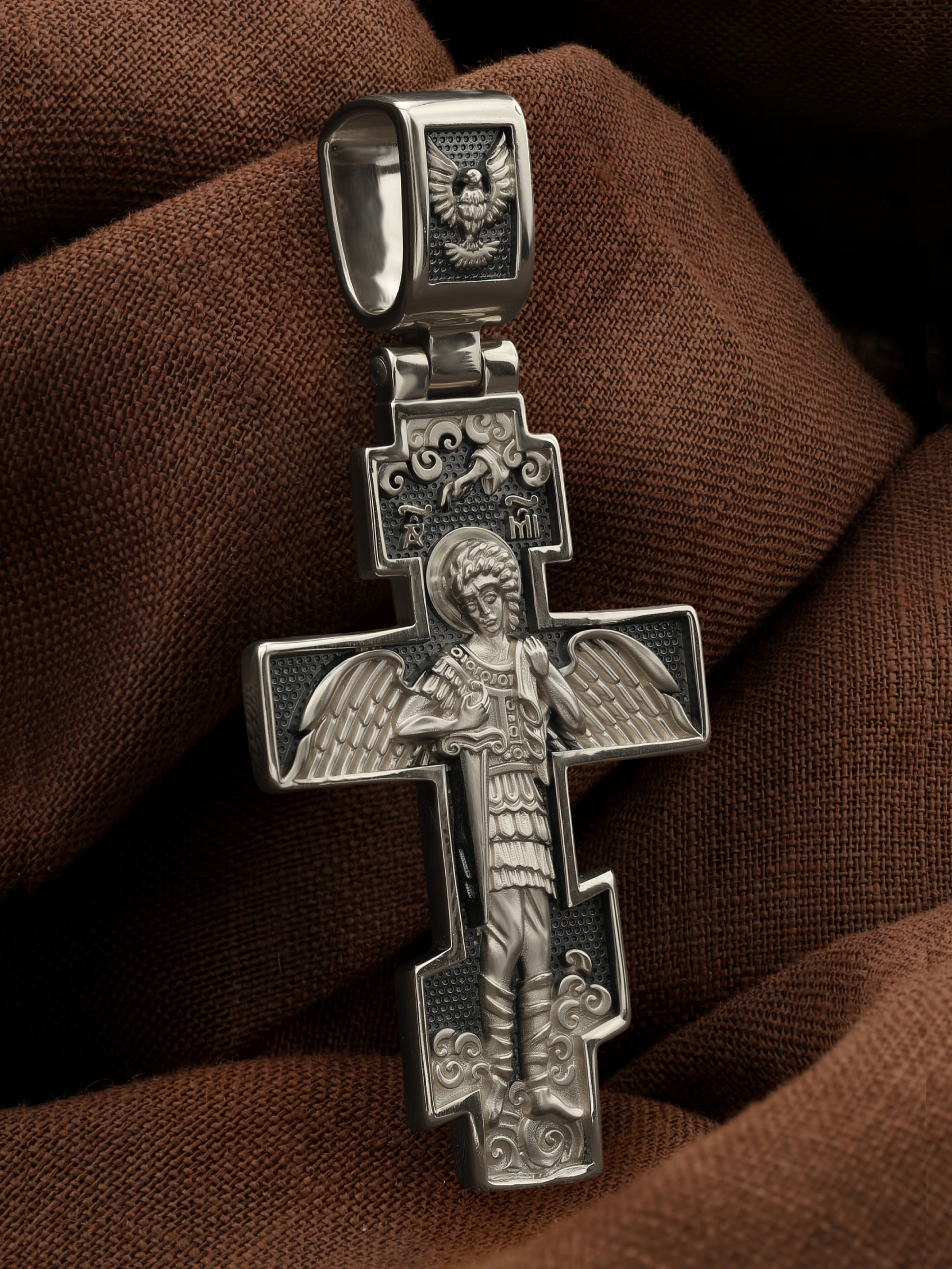 На оборотной стороне креста помещен Архангел Михаил, самый могущественный из ангелов. Это он низверг дьявола и встал во главе ангелов для борьбы с бесовскими силами. Его имя означает «Кто яко Бог?», так как он самый могучий и грозный враг зла. Древнерусские князья и воины стремились обрести покровительство Небесного Воеводы и нередко украшали свои шлемы его крылатой фигурой. На Руси также верили, что Архангел Михаил, как непримиримый враг дьявола, защищает и души умерших от бесовских нападений, провожая их на Небеса. Поэтому ему часто посвящались кладбищенские церкви.