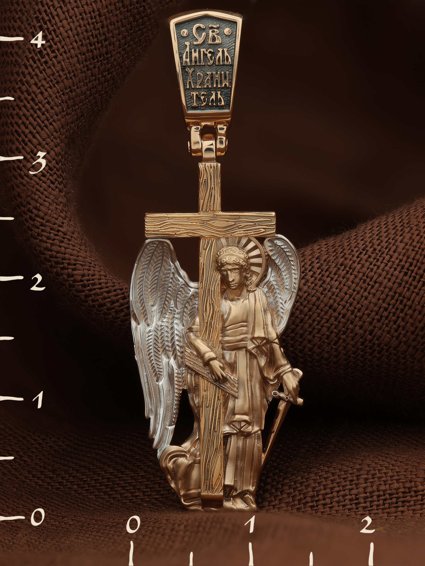 Основой композиции является изображение Святого Ангела-Хранителя держащего в правой руке крест, а в левой — мечь. Крест является символом жертвенной любви всеблагого Бога к падшим людям, всепобеждающим духовным оружием христиан, основанием и средоточием церковной жизни. Господь сказал: «кто хочет идти за Мною, отвергнись себя, и возьми крест свой, и следуй за Мною». (Мк. 8: 34). Ангел-Хранитель — это Ангел приставляемый Богом к человеку при крещении для охраны и помощи в добрых делах. Он невидимо находится при человеке на протяжении всей его жизни, если человек сохраняет в себе любовь к Богу и истинную веру перед Ним. Ангел-Xранитель делают для нас все, что служит к истинному нашему благу и спасению. Невидимо пребывая при нас постоянно, он, руководствуя нас ко спасению, не только по нашему желанию таинственно наставляет нас на все доброе и полезное, не только возносит наши молитвы к Богу, но еще и сам от себя охраняют и защищают нас от врагов видимых и невидимых и ходатайствует за нас пред Богом. Ангел-Хранитель так любит нас, как никто на земле любить не может. Ангел-Хранитель — присный друг наш, незримый тихий собеседник, пресладостный утешитель.