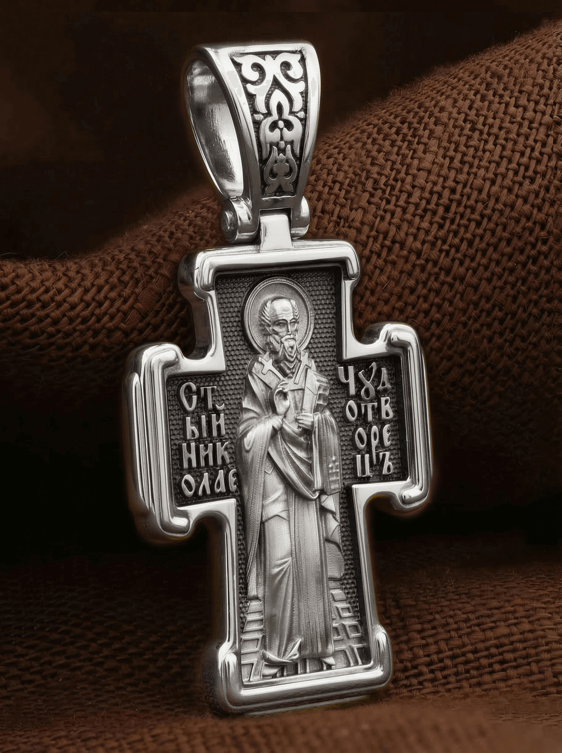 На оборотной стороне креста изображен святитель Николай архиепископ Мир Ликийских, Чудотворец. Он является одним из самых почитаемых святых в православном мире. Святитель Николай родился во второй половине III века в Малой Азии в Ликийском городе Патары. С рождения Божий Угодник проявлял необыкновенные дарования. Сохранилось Предание, что во время крещения он, никем не поддерживаемый, простоял в купели три часа. С детства святитель избегал пустых развлечений, любил молитву, прекрасно учился и проводил свободное время за чтением Священного писания. Приняв сан священника, святитель Николай стал проводить еще более строгую подвижническую жизнь. Вся жизнь святого Николая — это служение Богу. Много великих и преславных чудес сотворил на земле и на море великий Святитель Николай Угодник. Он помогал сущим в бедах, укрощал штормы, спасал от потопления и выносил на сушу из глубины морской, освобождал из плена и приносил освобожденных домой, избавлял от уз и темницы, защищал от посечения мечом, освобождал от смерти и подавал многим различные исцеления, слепым прозрение, хромым хождение, глухим слух, немым дар слова.