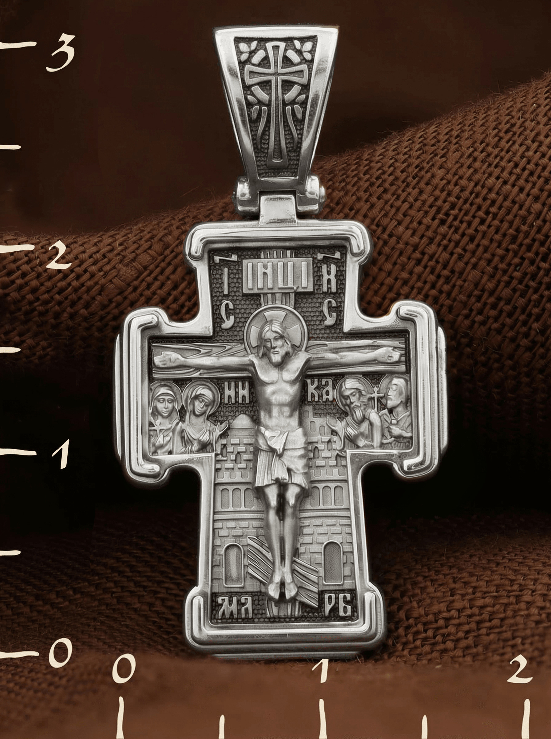 На лицевой стороне креста изображено Распятие Господа и Спасителя нашего Иисуса Христа. Крест- символ спасения и искупления рода человеческого, знамение победы над смертью и адом. Иисус Христос, как искупительная жертва освобождения человечества от власти греха, умер крестной смертью и в третий день воскрес. На верхней табличке, выше головы Иисуса, расположена надпись, составленная Понтием Пилатом — «IНЦI». Она означает «Иисус Назорей, Царь Иудейский». Рядом расположена надпись «IС» « ХС». Она означает Иисус Христос. Ниже — слово «НИКА», что означает «победитель». Слева от Распятия — Пресвятая Богородица и святая мироносица Мария Магдалина с крестом в руке. Справа — апостол и евангелист Иоанн Богослов, один из ближайших учеников Иисуса Христа, и сотник Лонгин с крестом в правой руке и копьем — в левой. За крестом высится Иерусалимская стена. Надпись «МЛРБ» — «место лобное рай бысть» означает, что место лобное стало раем, помещается в нижней части креста. На кулонном кольце помещен крест.