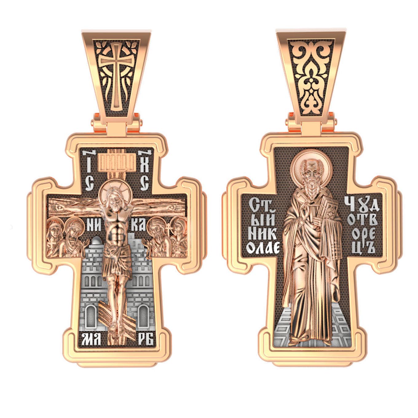 На оборотной стороне креста изображен святитель Николай архиепископ Мир Ликийских, Чудотворец. Он является одним из самых почитаемых святых в православном мире. Святитель Николай родился во второй половине III века в Малой Азии в Ликийском городе Патары. С рождения Божий Угодник проявлял необыкновенные дарования. Сохранилось Предание, что во время крещения он, никем не поддерживаемый, простоял в купели три часа. С детства святитель избегал пустых развлечений, любил молитву, прекрасно учился и проводил свободное время за чтением Священного писания. Приняв сан священника, святитель Николай стал проводить еще более строгую подвижническую жизнь. Вся жизнь святого Николая — это служение Богу. Много великих и преславных чудес сотворил на земле и на море великий Святитель Николай Угодник. Он помогал сущим в бедах, укрощал штормы, спасал от потопления и выносил на сушу из глубины морской, освобождал из плена и приносил освобожденных домой, избавлял от уз и темницы, защищал от посечения мечом, освобождал от смерти и подавал многим различные исцеления, слепым прозрение, хромым хождение, глухим слух, немым дар слова.