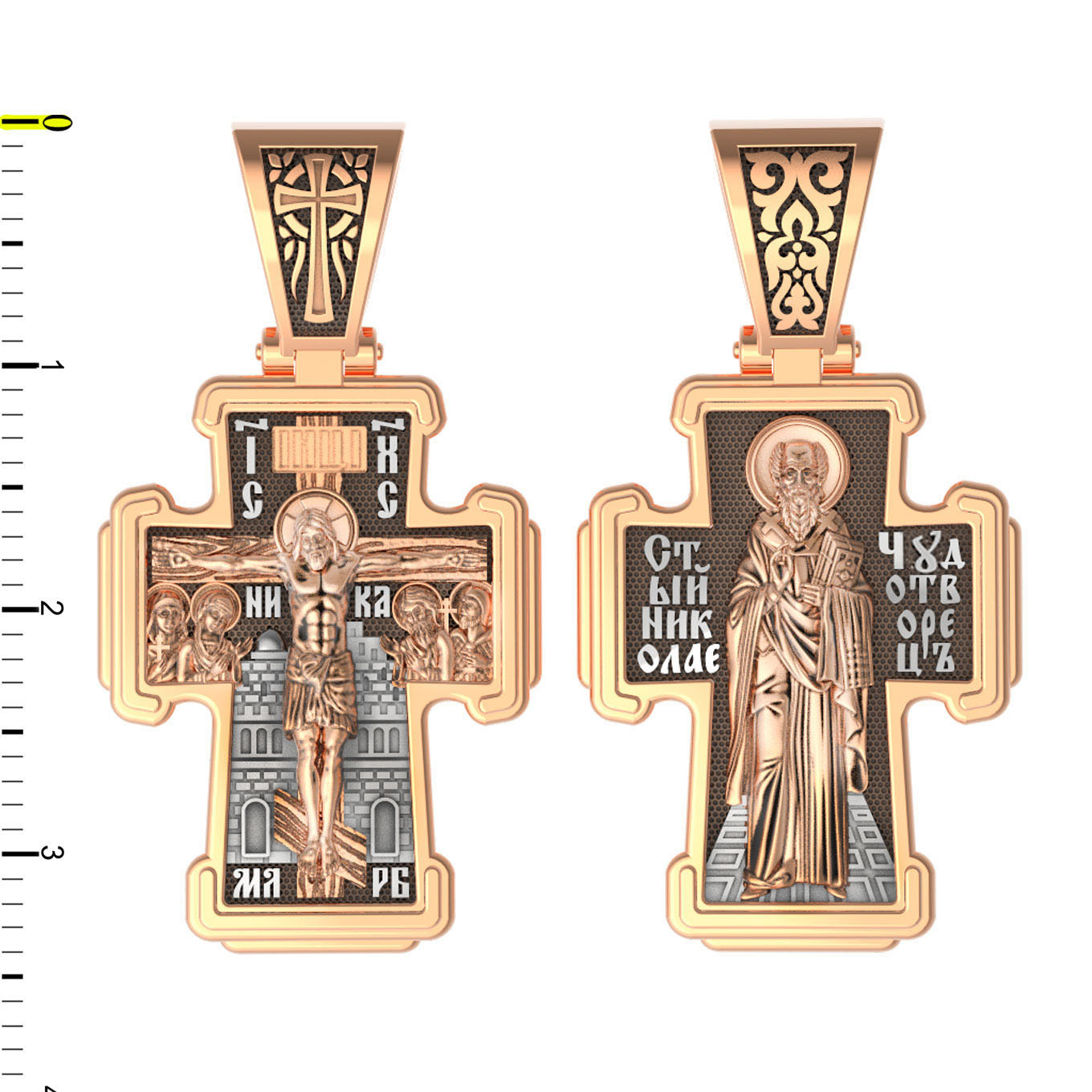 На лицевой стороне креста изображено Распятие Господа и Спасителя нашего Иисуса Христа. Крест- символ спасения и искупления рода человеческого, знамение победы над смертью и адом. Иисус Христос, как искупительная жертва освобождения человечества от власти греха, умер крестной смертью и в третий день воскрес. На верхней табличке, выше головы Иисуса, расположена надпись, составленная Понтием Пилатом — «IНЦI». Она означает «Иисус Назорей, Царь Иудейский». Рядом расположена надпись «IС» « ХС». Она означает Иисус Христос. Ниже — слово «НИКА», что означает «победитель». Слева от Распятия — Пресвятая Богородица и святая мироносица Мария Магдалина с крестом в руке. Справа — апостол и евангелист Иоанн Богослов, один из ближайших учеников Иисуса Христа, и сотник Лонгин с крестом в правой руке и копьем — в левой. За крестом высится Иерусалимская стена. Надпись «МЛРБ» — «место лобное рай бысть» означает, что место лобное стало раем, помещается в нижней части креста. На кулонном кольце помещен крест.