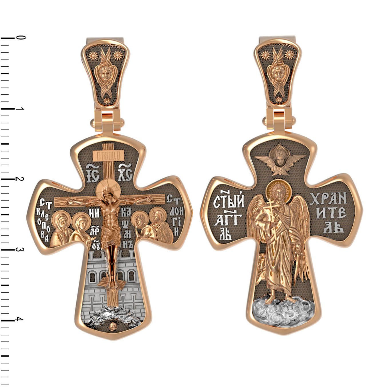 На лицевой стороне креста изображено Распятие Господа и Спасителя нашего Иисуса Христа, отдавшего Себя на смерть, для искупления грехов мира. Господь сказал: кто хочет идти за Мною, отвергнись себя, и возьми крест свой, и следуй за Мною. (Мк. 8: 34). Крест является символом жертвенной любви всеблагого Бога к падшим людям, всепобеждающим духовным оружием христиан, основанием и средоточием церковной жизни. На верхней перекладине помещена надпись «IС» « ХС», что означает Иисус Христос. Ниже — слово «НИКА», что означает «победитель». Слева от Распятия изображена Пресвятая Богородица, справа — апостол и евангелист Иоанн Богослов, один из ближайших учеников Иисуса Христа. За Распятием высится Иерусалимская стена, в знак того, что Господь был распят вне стен города. Возвышение, на котором стоит Крест, символизирует гору Голгофу, на которой произошло Распятие. Под подножием Креста изображена покоящаяся голова (череп) Адама. На кулонном кольце помещен крест.