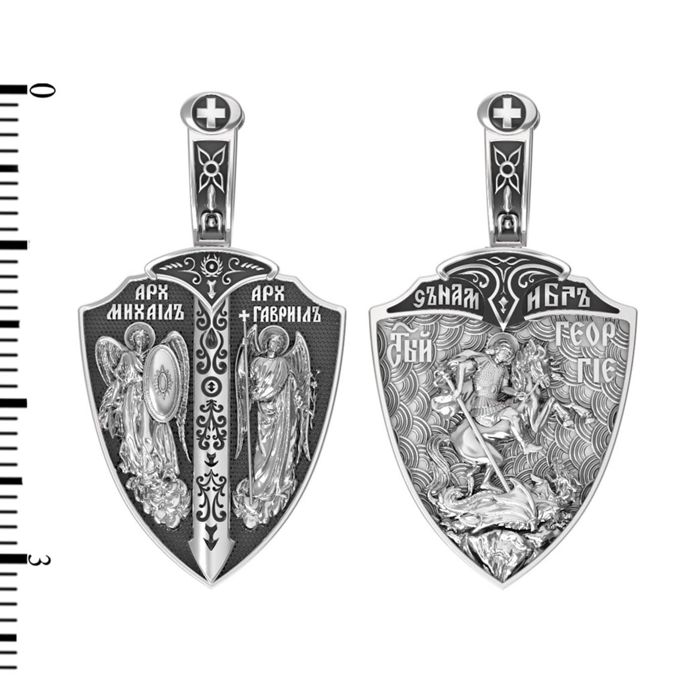 Основой композиции оборотной стороны является изображение Святого Георгия Победоносца. Святой Георгий один из наиболее почитаемых святых в Христианской Церкви. На Руси он известен как Юрий или Егорий, покровитель воинов. На образке изображено самое знаменитое чудо святого: спасение принцессы от змея, которому она предназначалась в жертву. Чудо это имеет символическое толкование. Принцесса означает душу человеческую, а змей — дьявола, желающего ее поглотить. Святой Георгий, небесный защитник, спускается с Небес, чтобы помочь душе избавиться от гибели. Образ святого воина венчают слова: «С нами Бог!». Они написаны у рукоятки меча, узорчатый клинок которого разделяет образок на две части. Сам образок имеет форму щита. Щит и меч — это символы духовной брани с дьяволом.
