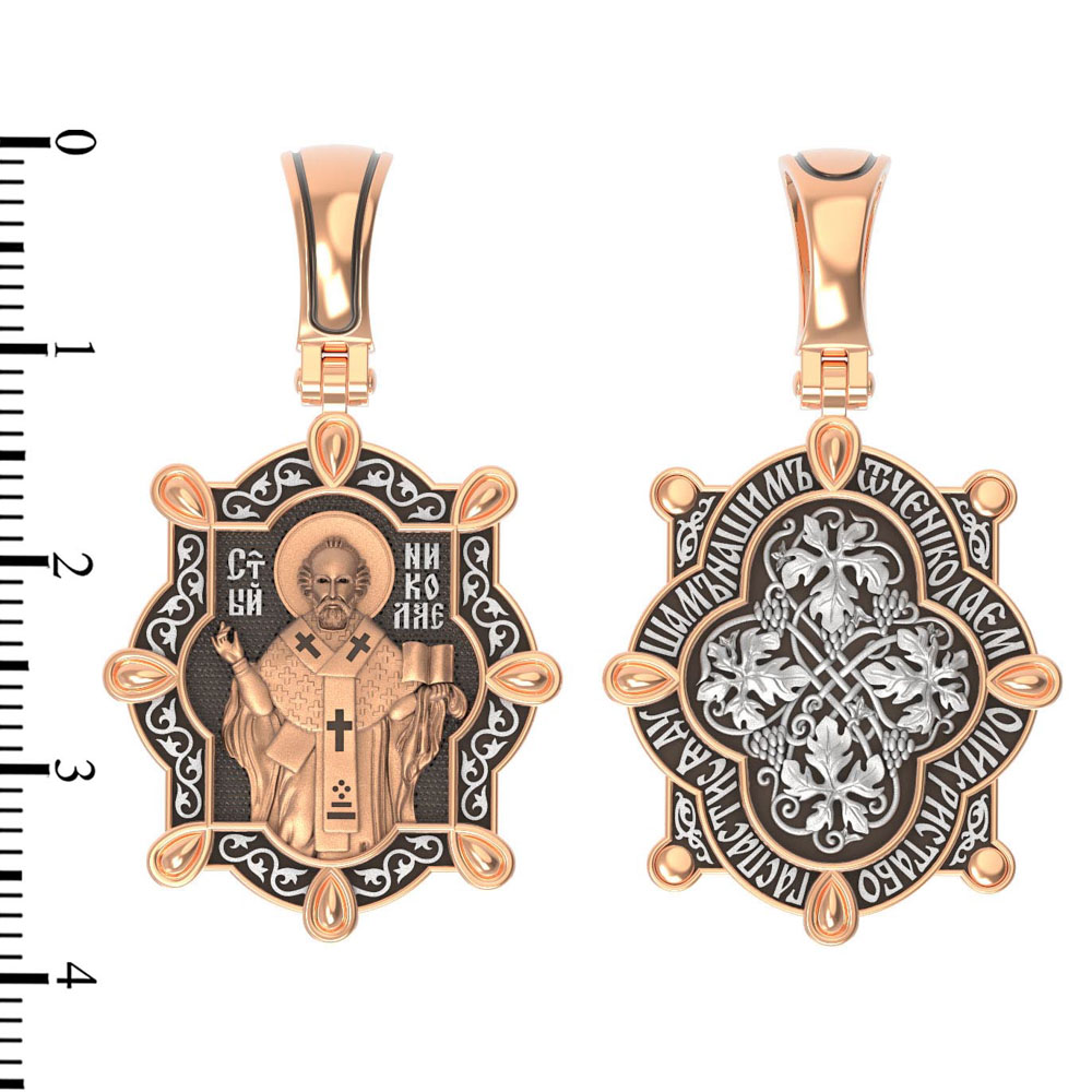 На лицевой стороне образка изображен Святитель Николай архиепископ Мир Ликийских, Чудотворец. Он является одним из самых почитаемых святых в православном мире. Святитель Николай родился во второй половине III века в Малой Азии в Ликийском городе Патары. Сохранилось Предание, что во время крещения он простоял в купели три часа. С детства Святитель избегал развлечений, любил молитву, прекрасно учился и проводил свободное время за чтением Священного писания. Приняв сан священника, святитель Николай стал проводить еще более строгую подвижническую жизнь. Вся жизнь святого Николая — это служение Богу. Он помогал сущим в бедах, укрощал штормы, спасал от потопления и выносил на сушу из глубины морской, освобождал из плена и приносил освобожденных домой, избавлял от темницы, освобождал от смерти, подавал различные исцеления: слепым — прозрение, глухим — слух, немым — дар слова.