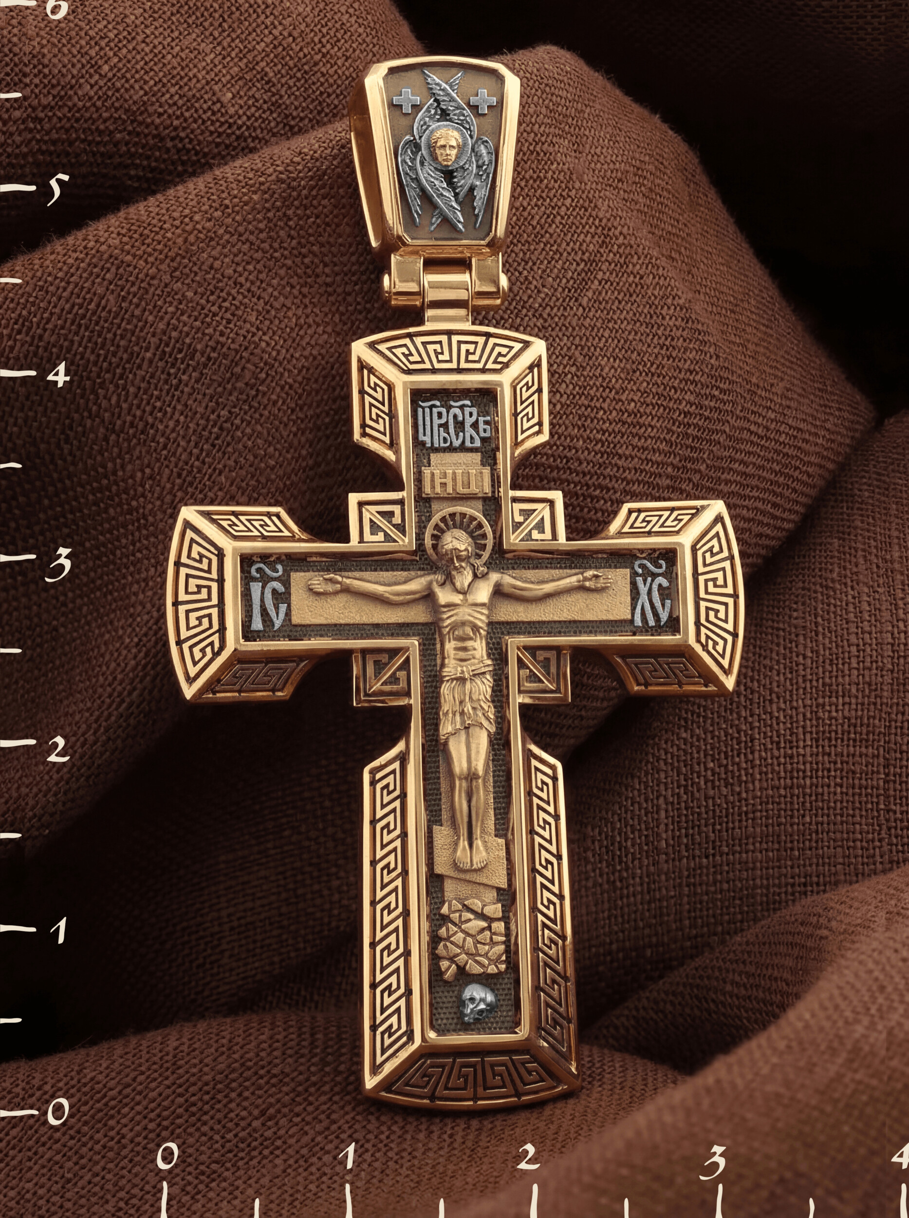 Рамка, украшенная византийским орнаментальным мотивом, обрамляет простой и очень традиционный нательный крест.