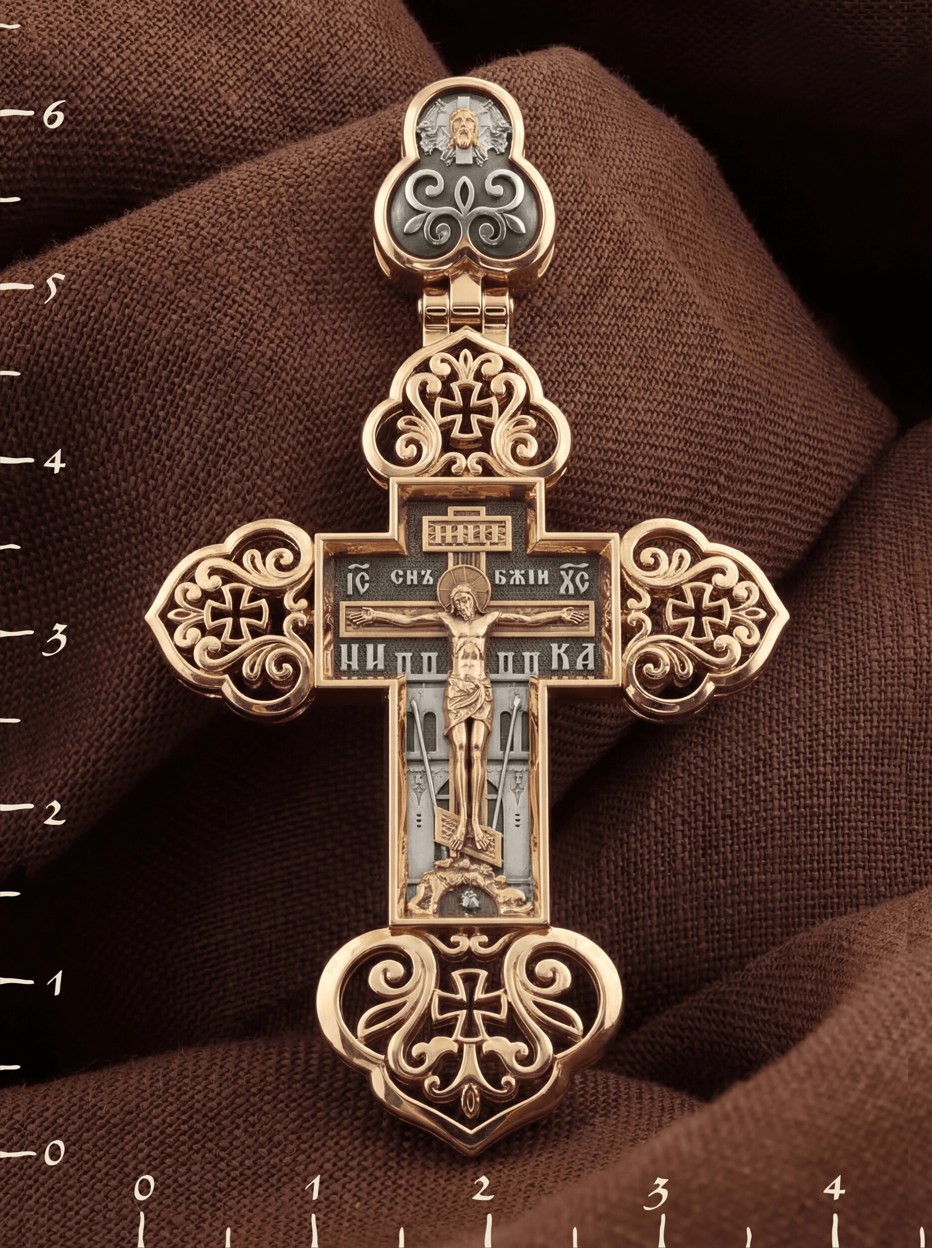 На лицевой стороне изображено Распятие. Позади Распятия видна иерусалимская стена, знак того, что Господь был распят вне стен города. Но вместе с тем стена символизирует и Небесный Иерусалим, путь который открылся для человека через Голгофу. У подножья Господа в виде скалистой горки видна сама Голгофа с Главой Адамовой в пещере. Рядом с Крестом из горы выступают орудия страданий Господа — трость и копие, обозначенные буквами Т и К. На трости стражники подали Христу пропитанную уксусом губку, когда Он жаждал воды, а копьем пронзили Ему ребра, чтобы проверить: умер ли Он?