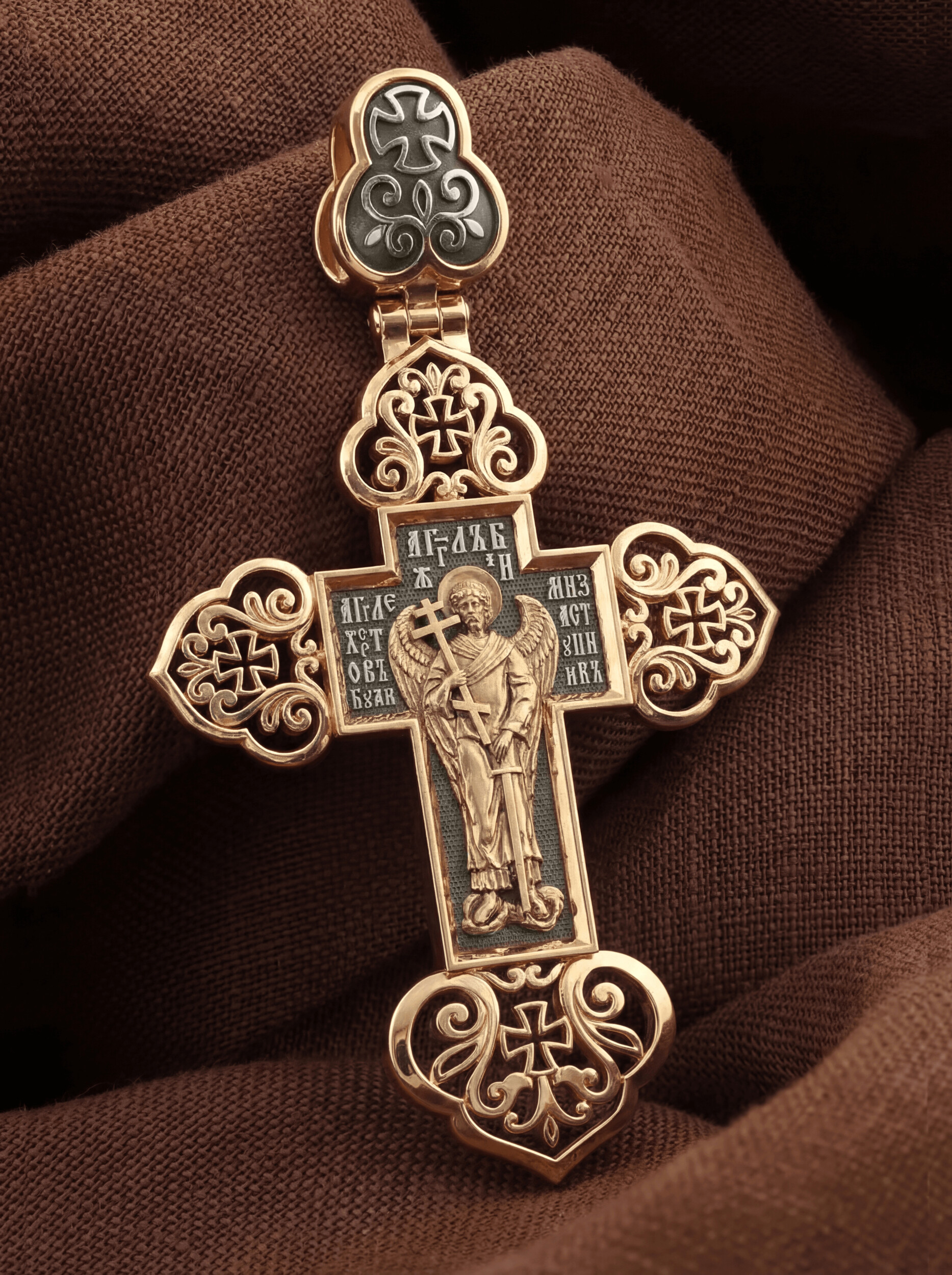 Оборотную сторону креста возглавляет Ангел Хранитель с крестом и мечом: ими он защищает человека от злых духовных и физических нападений. Ангел не может нарушить свободу воли человека, поэтому его надо молитвенно просить о помощи: «Ангеле Христов, буди ми заступник», — эта молитва написана вокруг его образа.