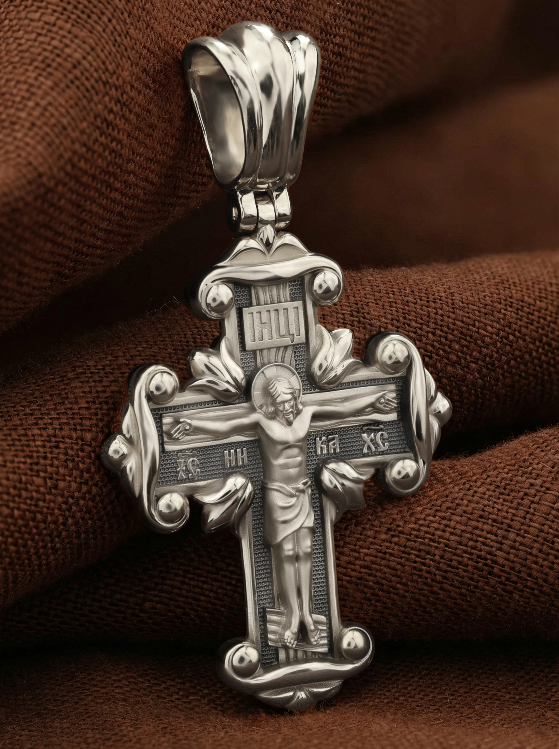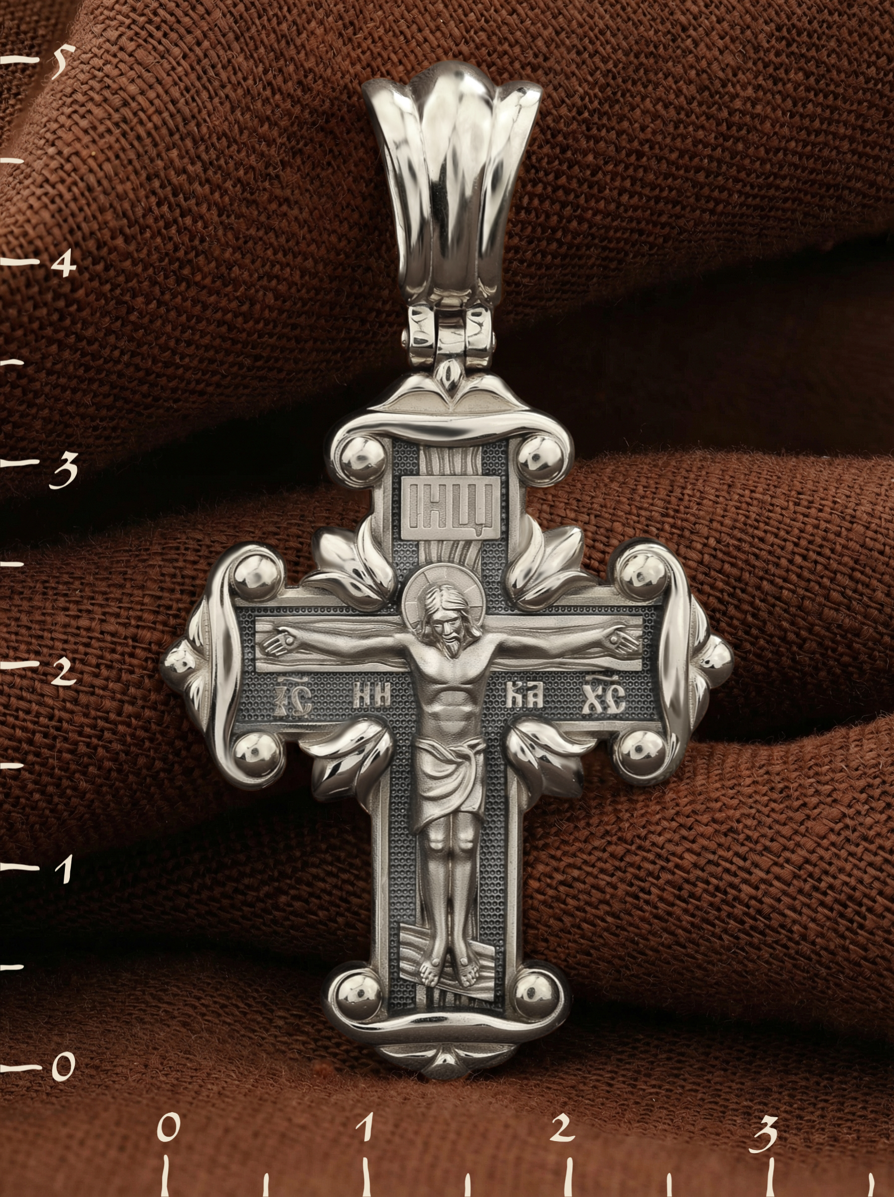 На лицевой стороне креста изображено Распятие Господа и Спасителя нашего Иисуса Христа, отдавшего Себя на смерть, для искупления грехов мира. Крест является символом жертвенной любви Всеблагого Бога к падшим людям, всепобеждающим духовным оружием христиан, основанием и средоточием церковной жизни. Господь сказал: кто хочет идти за Мною, отвергнись себя, и возьми крест свой, и следуй за Мною. (Мк. 8: 34). На верхней табличке, выше головы Иисуса, расположена надпись, составленная Понтием Пилатом — «IНЦI». Она означает «Иисус Назорей, Царь Иудейский». Надпись «IC» «ХC», означает Иисус Христос, помещается на разных сторонах поперечной перекладины креста. Рядом — слово «НИКА», что означает «победитель». На православном кресте Христос не умирает, а свободно простирает руки, ладони Иисуса открыты, будто он хочет обнять все человечество, даря им свою любовь и открывая путь к вечной жизни.