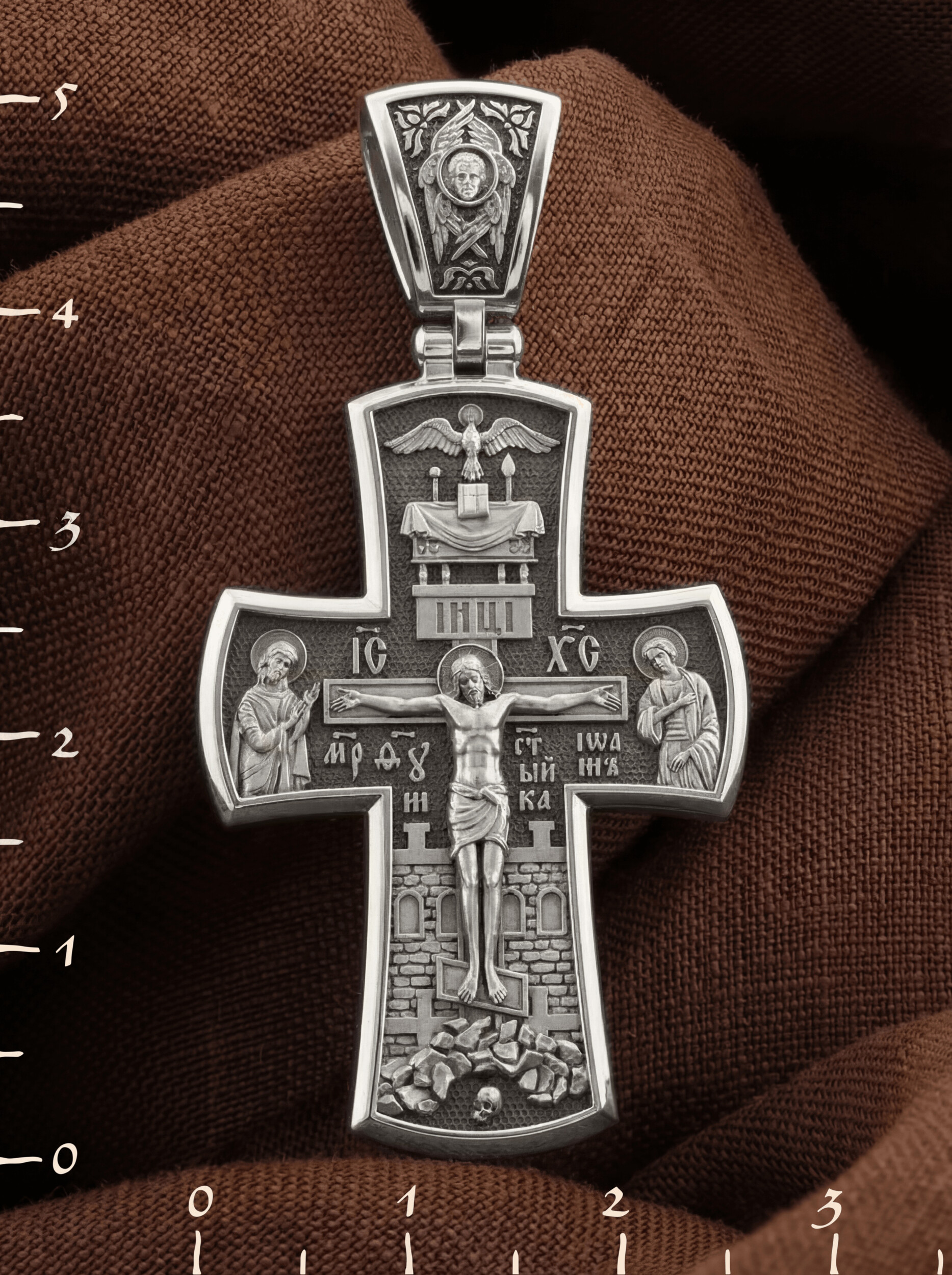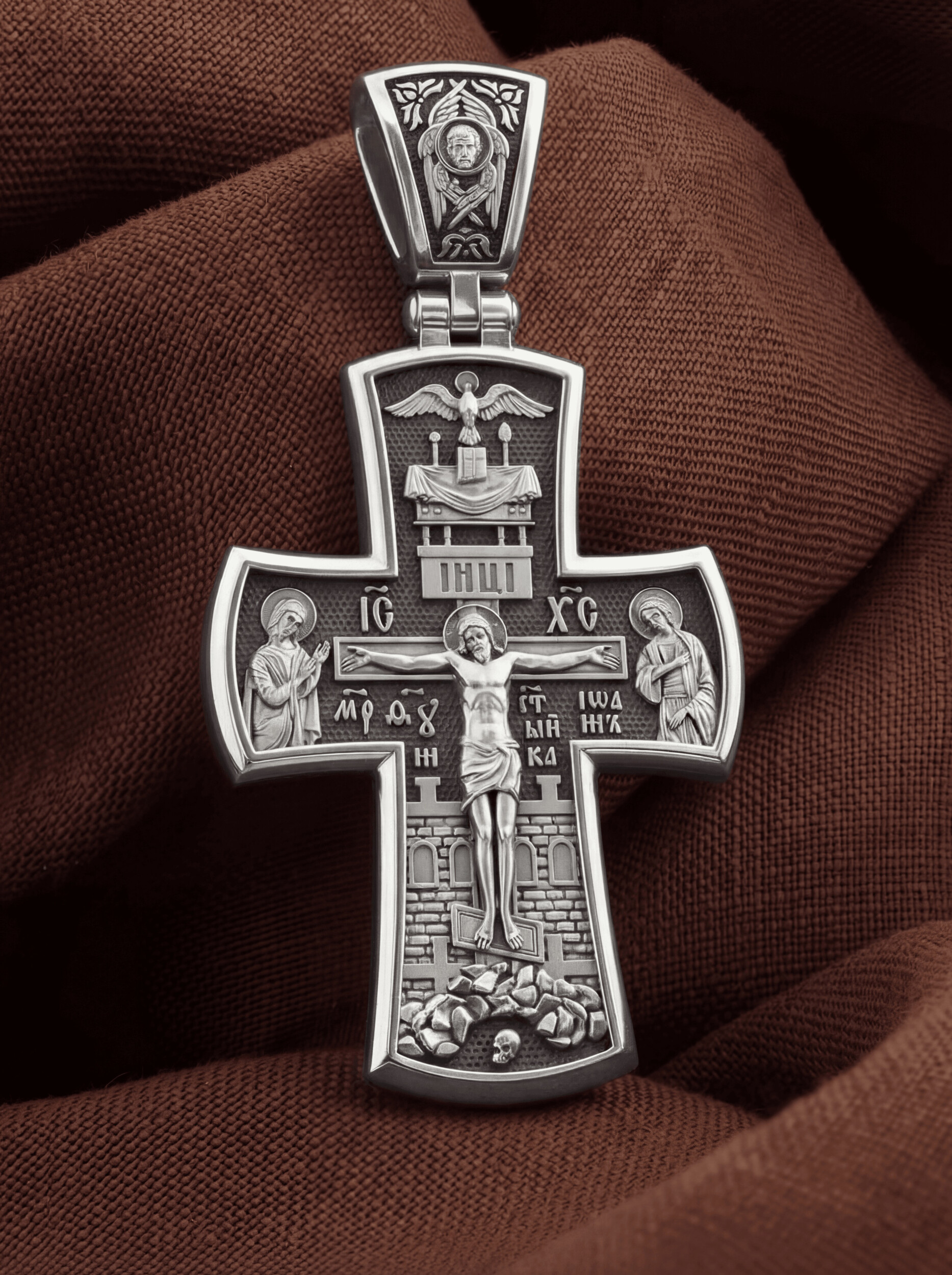 На лицевой стороне креста изображено Распятие Господа и Спасителя нашего Иисуса Христа, отдавшего Себя на смерть, для искупления грехов мира. Господь сказал: кто хочет идти за Мною, отвергнись себя, и возьми крест свой, и следуй за Мною. (Мк. 8: 34). Крест является символом жертвенной любви всеблагого Бога к падшим людям, всепобеждающим духовным оружием христиан, основанием и средоточием церковной жизни. На верхней перекладине помещена надпись «IС» « ХС», что означает Иисус Христос. Ниже — слово «НИКА», что означает «победитель». Слева от Распятия изображена Пресвятая Богородица, справа — апостол и евангелист Иоанн Богослов, один из ближайших учеников Иисуса Христа. За Распятием высится Иерусалимская стена, в знак того, что Господь был распят вне стен города. Возвышение, на котором стоит Крест, символизирует гору Голгофу, на которой произошло Распятие. Под подножием Креста изображена покоящаяся голова (череп) Адама.
